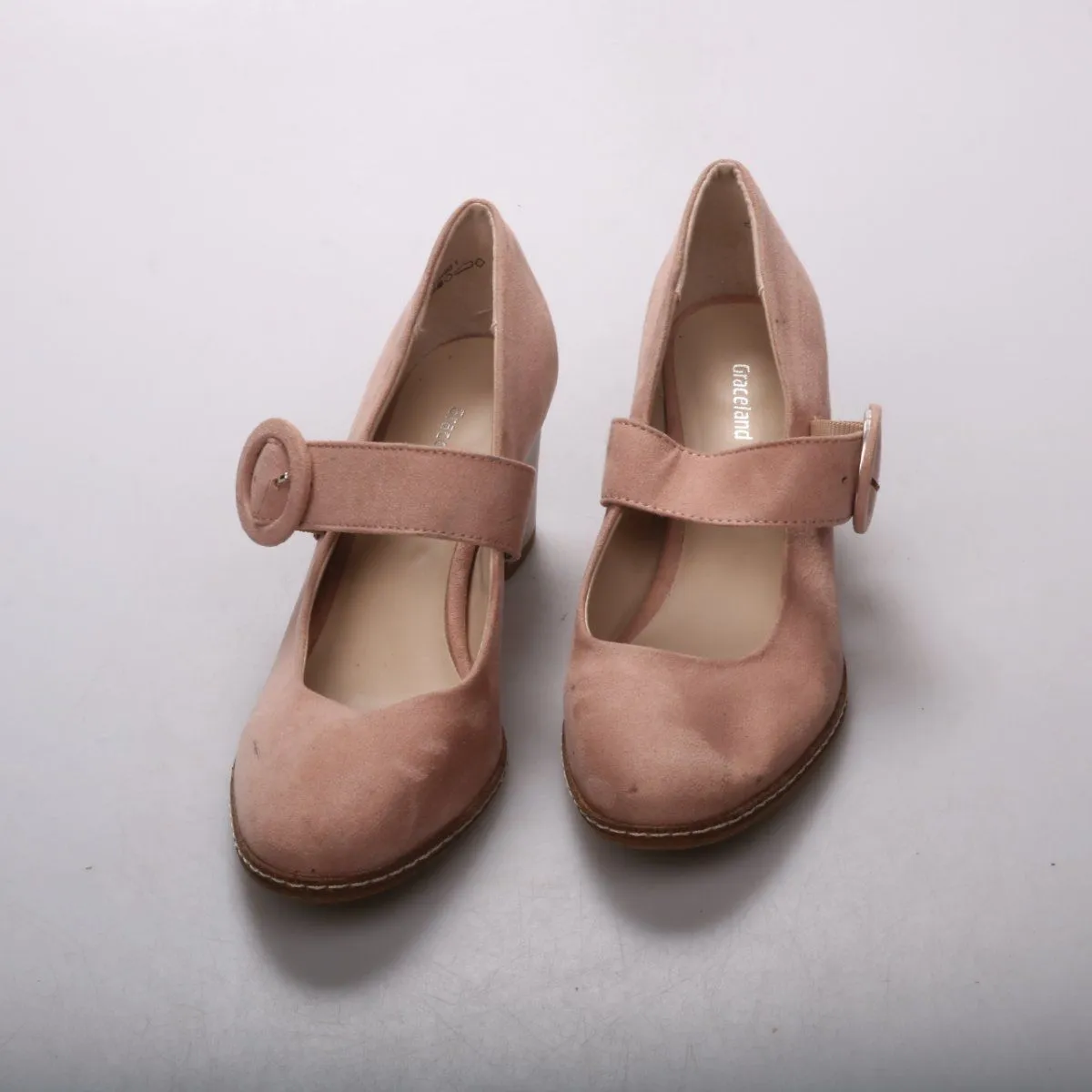 Туфли Graceland в пудрово-розовом цвете с ремешком (Mary Jane) и устойчивым блочным каблуком. Подойдут для офиса, мероприятий и повседневных образов в тёплое время года. Ремешок хорошо фиксирует стопу, а каблук более устойчив при ходьбе.