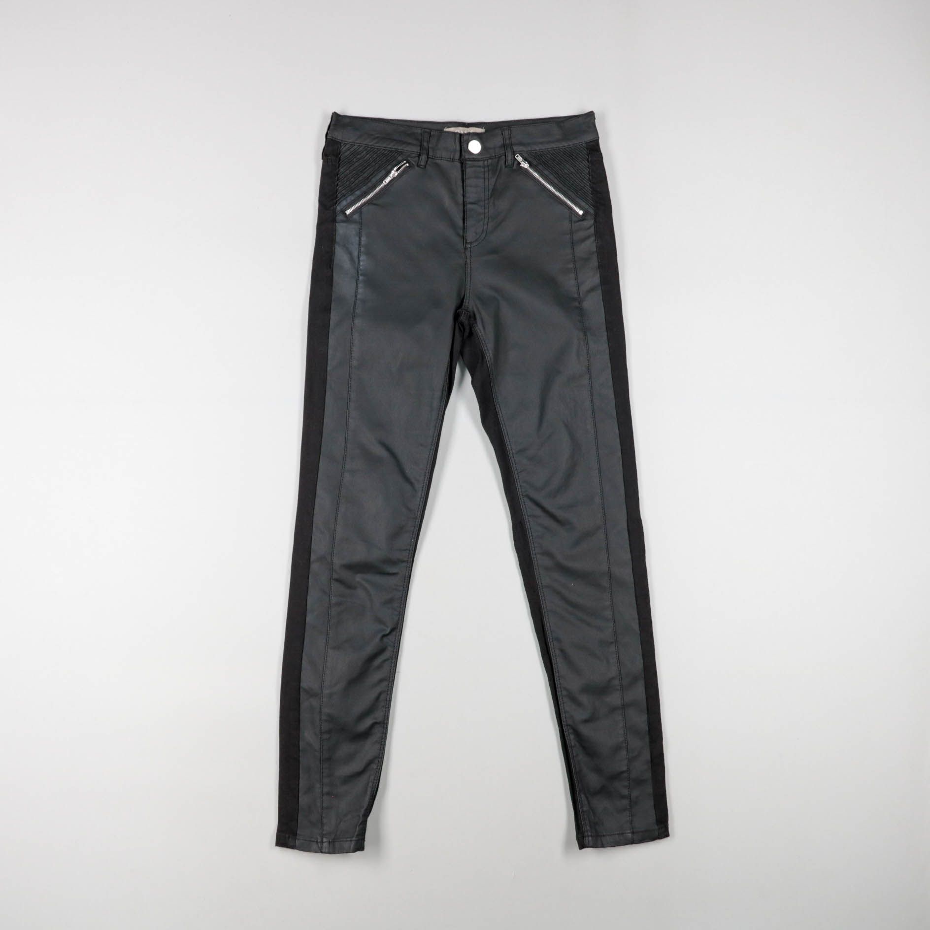 Женские зауженные брюки из материала под кожу, чёрного цвета, с декоративными молниями на карманах. Подойдут для повседневных образов и вечерних выходов, хорошо сочетаются с ботильонами или кедами. Практичный плюс — плотная ткань держит форму и легко к...