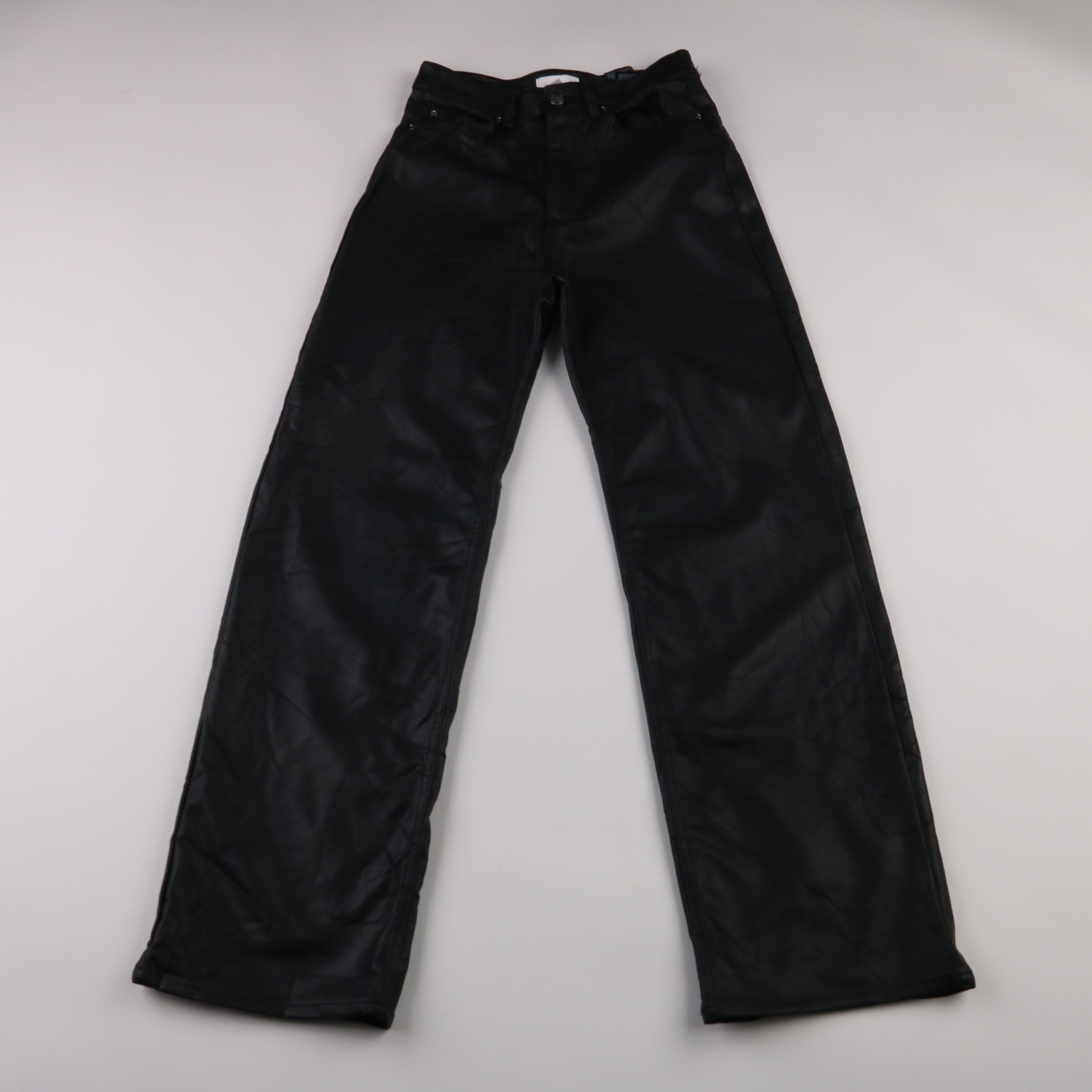 Женские брюки H&M из экокожи (полиэстер с полиуретановым покрытием) в базовом чёрном цвете. Подойдут для повседневных и вечерних образов с кедами или ботильонами. Практичны в уходе и легко сочетаются с любым верхом.