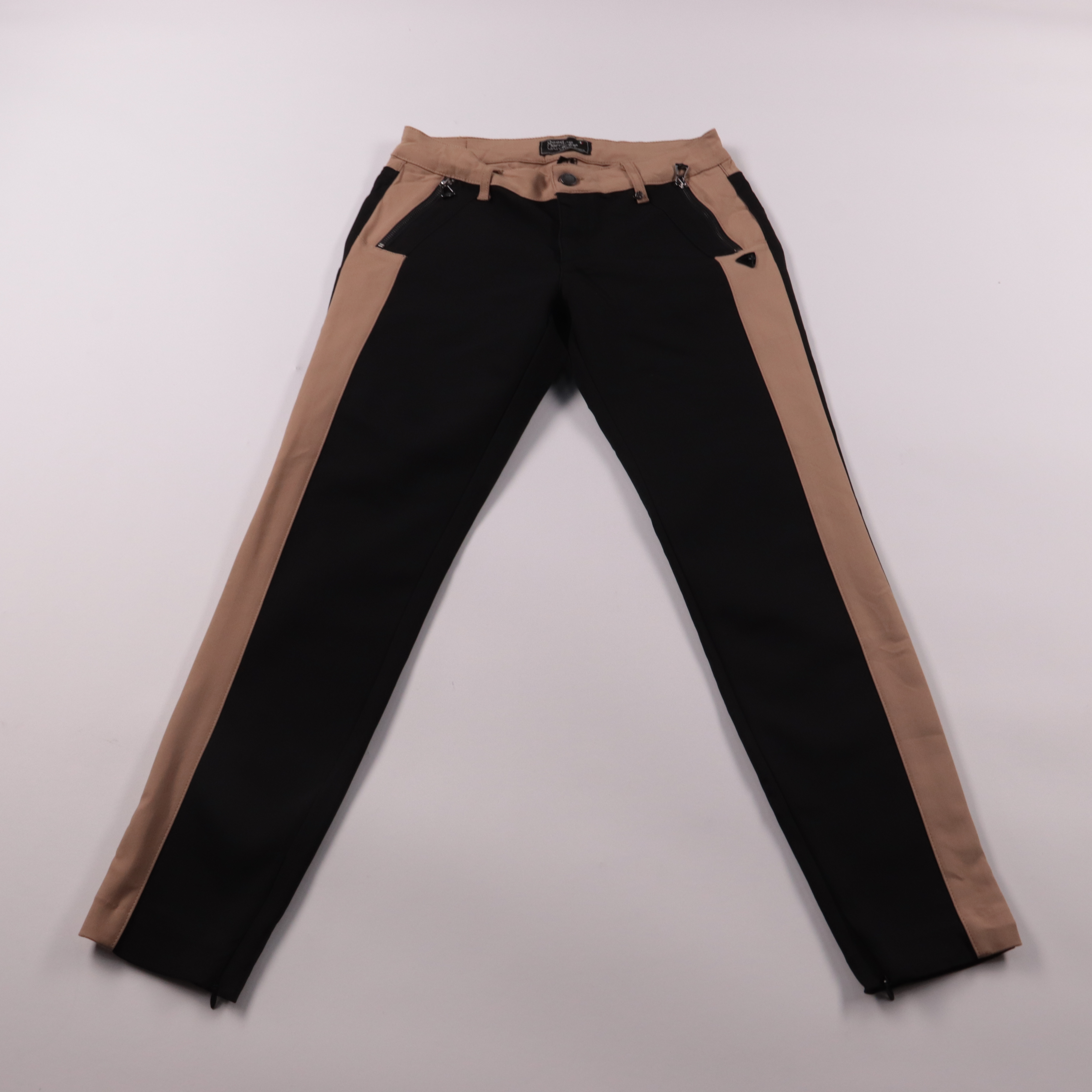 Женские брюки Good Morning Universe в контрастном дизайне: чёрная основа с бежевыми вставками и молниями на карманах. Подойдут для повседневных образов и городских прогулок, когда хочется добавить акцент к базовому верху. Плотная ткань держит форму, а ...