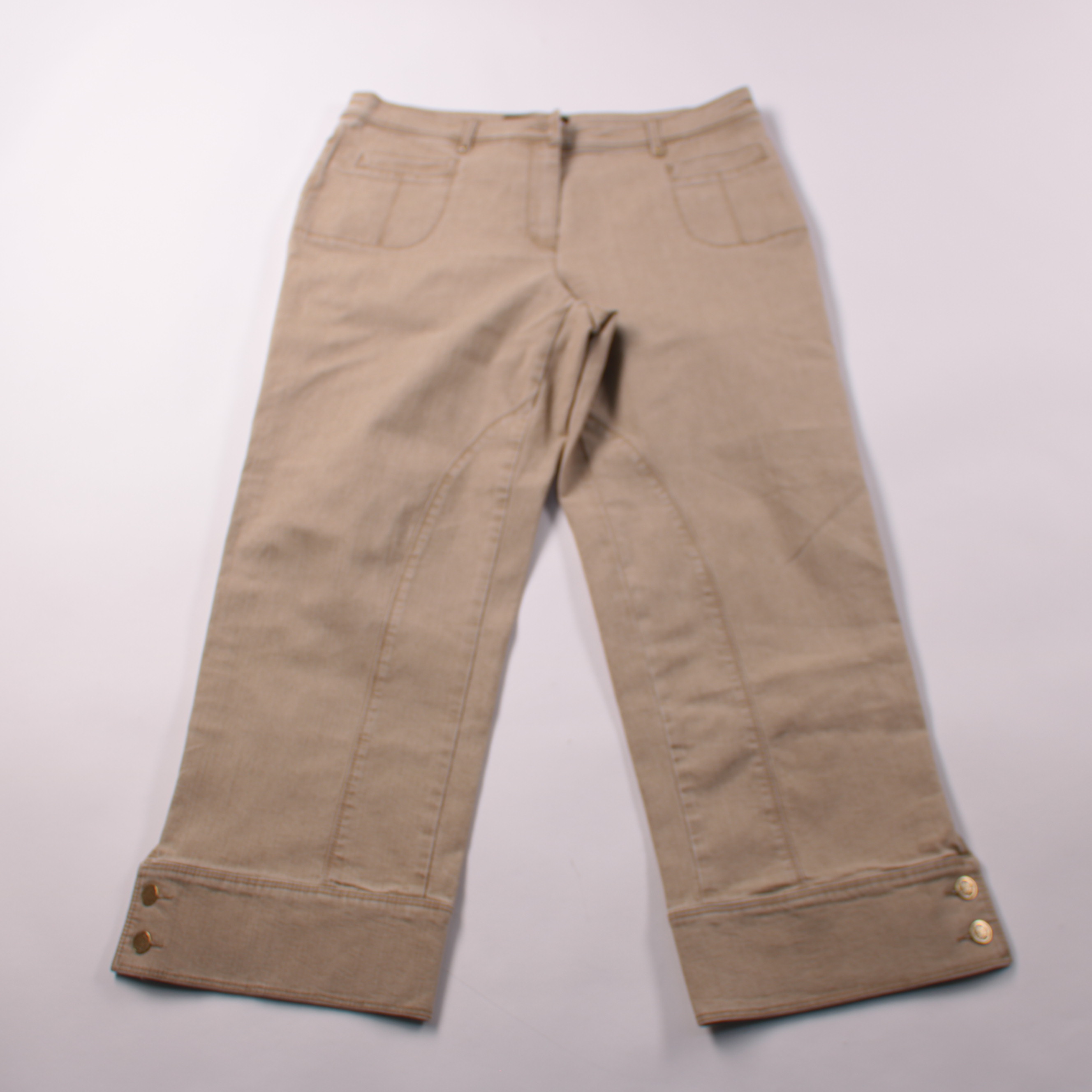 Женские брюки Gerry Weber бежевого цвета с отворотами и декоративными пуговицами по низу. Подойдут для повседневных и офисных образов в демисезон, хорошо сочетаются с рубашками и жакетами. Хлопковая ткань со стрейчем комфортно садится по фигуре и не ск...