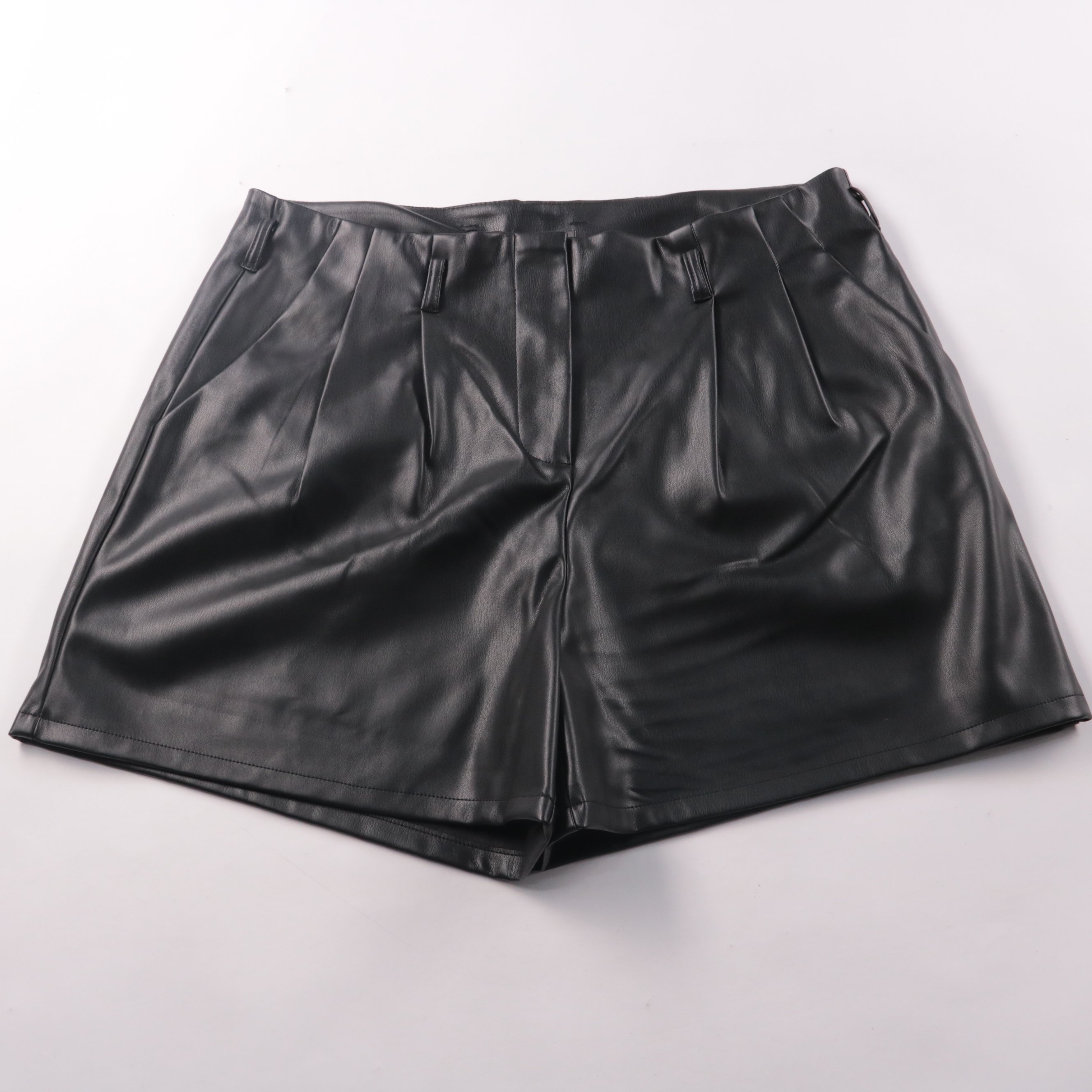 Женские шорты Primark из гладкой экокожи (полиэстер с полиуретановым покрытием), высокая посадка и складки спереди. Подойдут для летних образов с футболками, рубашками и жакетами. Материал легко протирается и не требует сложного ухода.