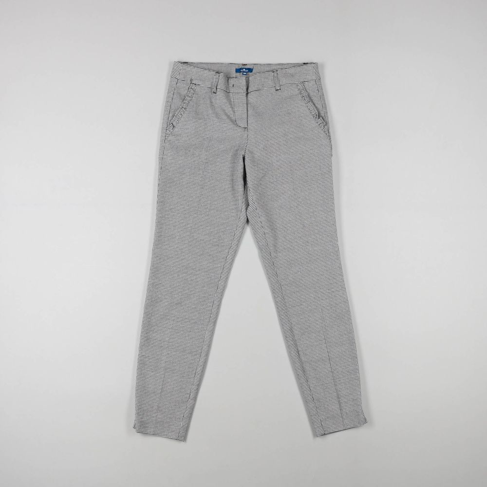 Женские брюки в мелкую клетку (гусиная лапка), зауженная модель со стрелкой и шлёвками под ремень. Подойдут для офиса и повседневных образов с рубашкой или свитером. Практичны тем, что немаркий рисунок и легко сочетаются с базовой обувью.