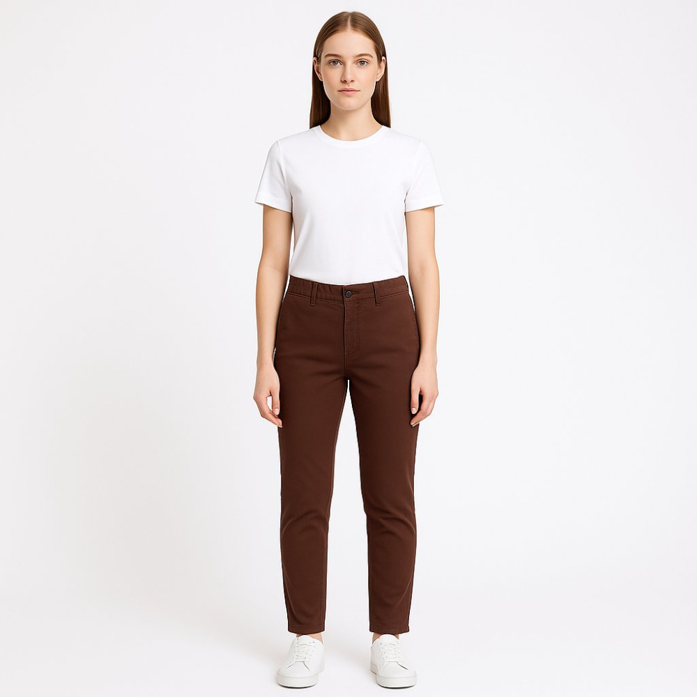Женские брюки Tchibo Women essentials прямого кроя в коричневом цвете, базовая модель на каждый день. Подойдут для офиса и повседневных образов с футболками, рубашками и кедами. Плотная ткань держит форму и удобна в носке.