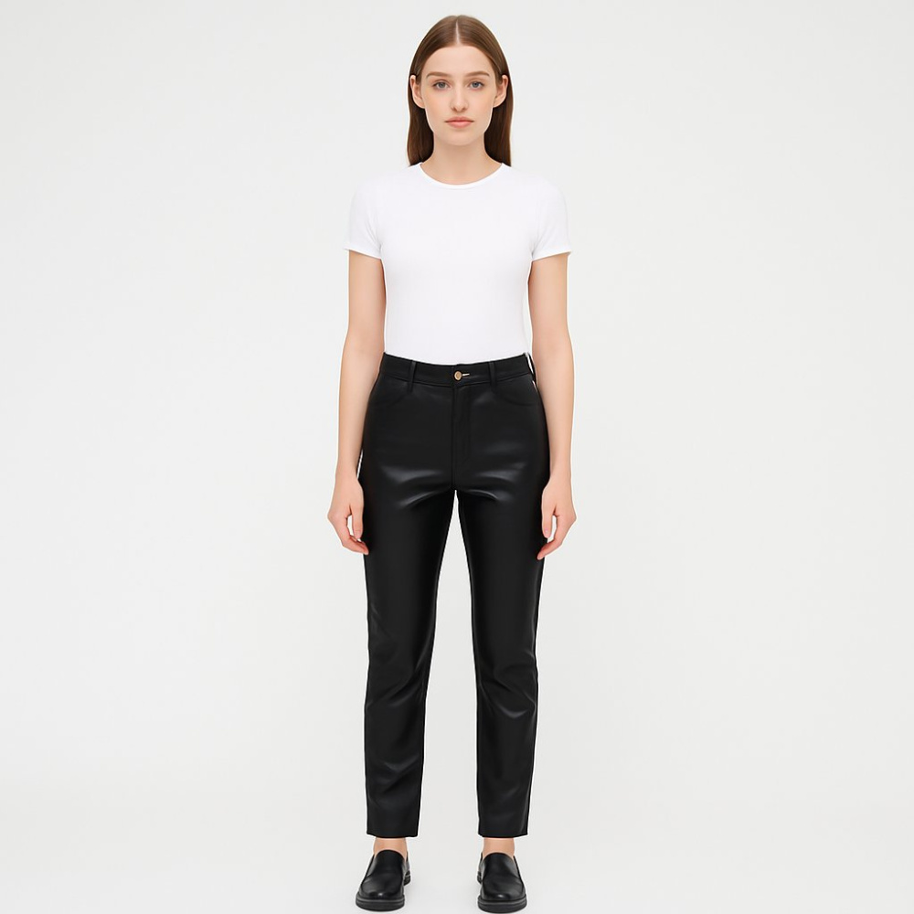 Женские брюки Ambria из гладкой экокожи чёрного цвета, прямого кроя с высокой посадкой. Подойдут для повседневных и офисных образов в прохладную погоду, хорошо сочетаются с футболками, рубашками и жакетами. Материал практичный: легко протираются и не т...