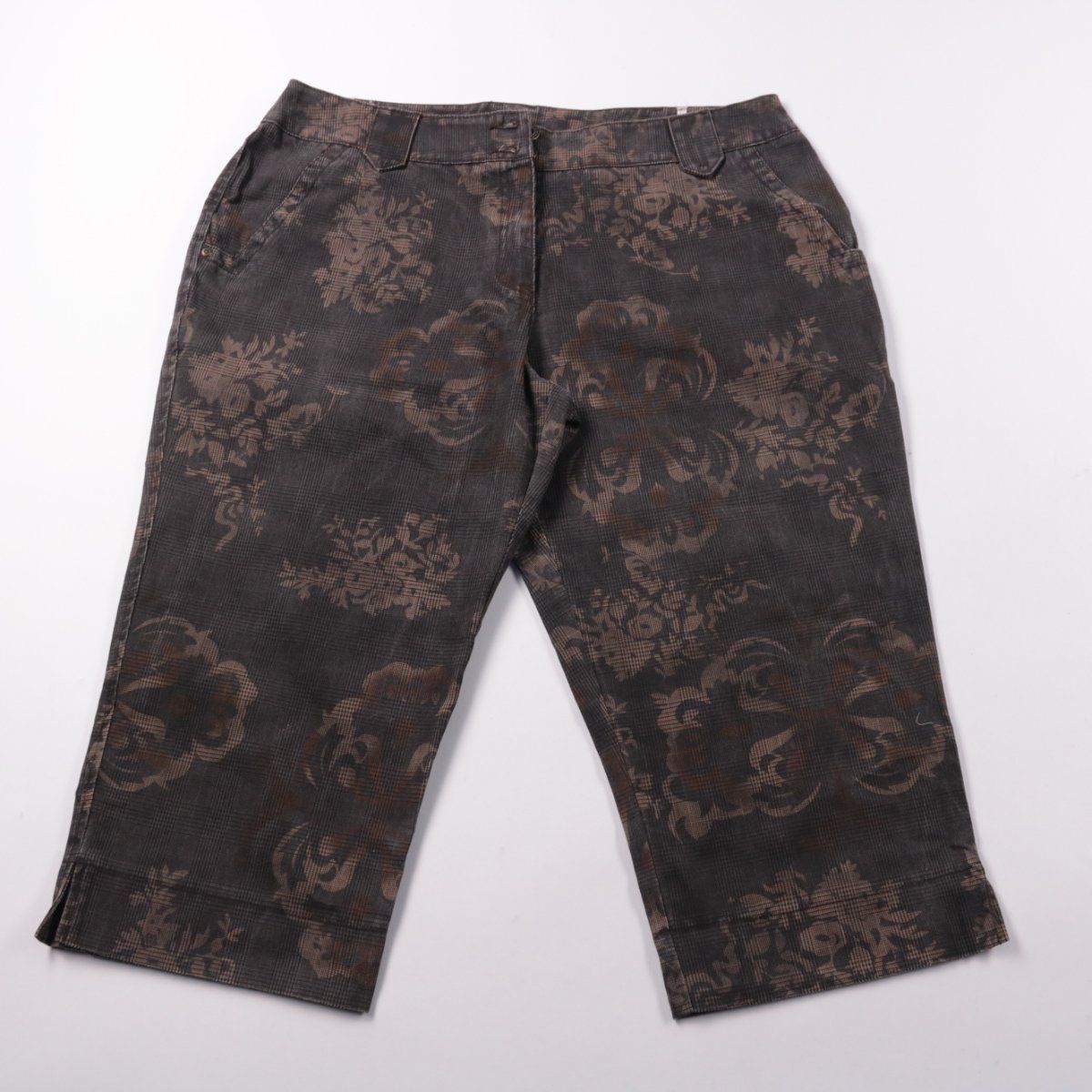 Брюки M&S укороченной длины с цветочным принтом на тёмной основе. Подойдут для повседневных образов в демисезон с однотонными топами и жакетом. Практичный смесовый материал (хлопок с полиэстером) меньше мнётся и проще в уходе.