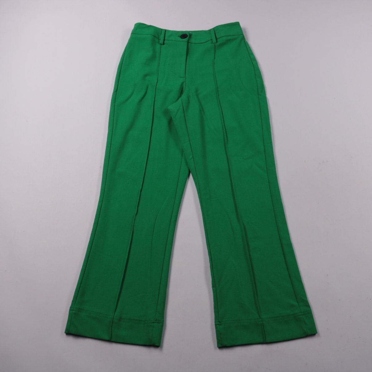 Женские брюки Bershka ярко-зелёного цвета, прямого кроя с заутюженными стрелками/рельефными линиями спереди. Подойдут для повседневных и офисных образов в тёплый сезон и в демисезон. Смесовая ткань с эластаном чуть тянется и комфортно садится по фигуре.