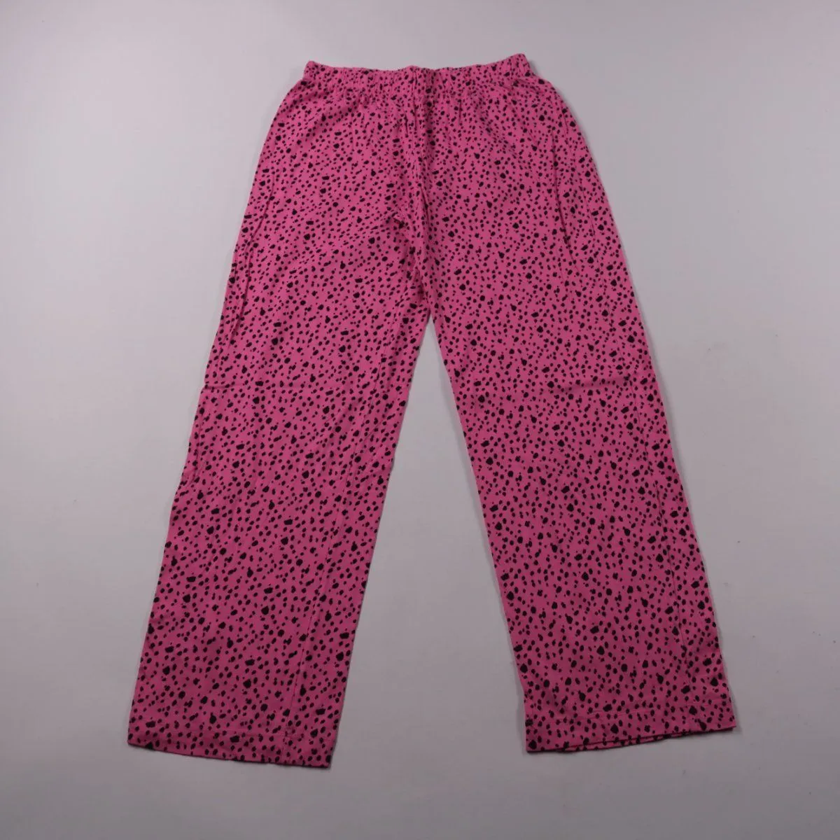 Женские прямые брюки F&F ярко-розового цвета с чёрным крапчатым принтом. Эластичный пояс делает посадку комфортной, подойдут для дома и отдыха. Практичное преимущество — мягкая ткань и удобная резинка без застёжек.