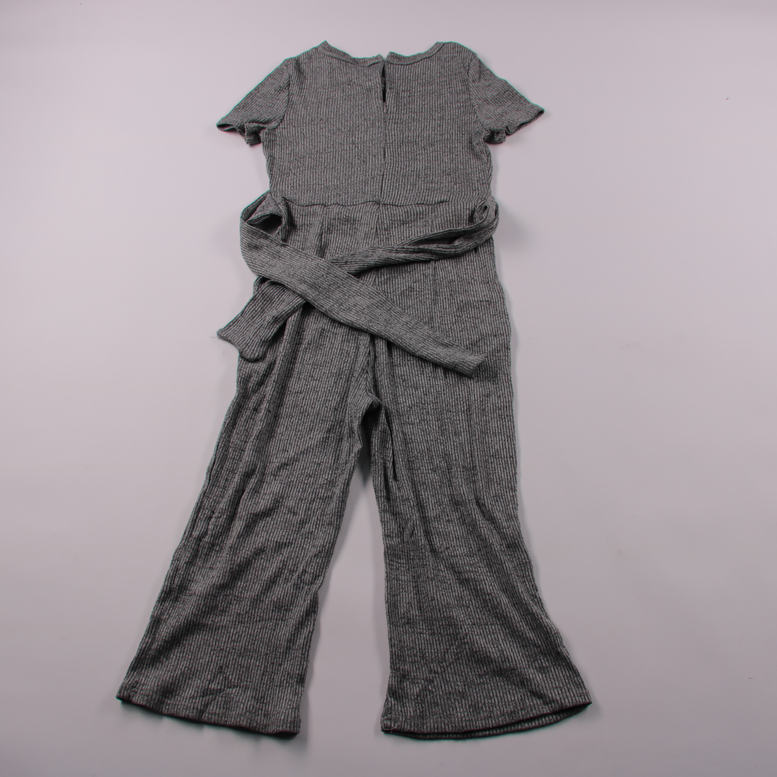 Женский трикотажный комбинезон Shein серого цвета в рубчик, с коротким рукавом и поясом на талии. Подойдёт для повседневных образов и прогулок в тёплую погоду или в помещении. Практичный плюс — мягкий материал тянется и удобно садится по фигуре.