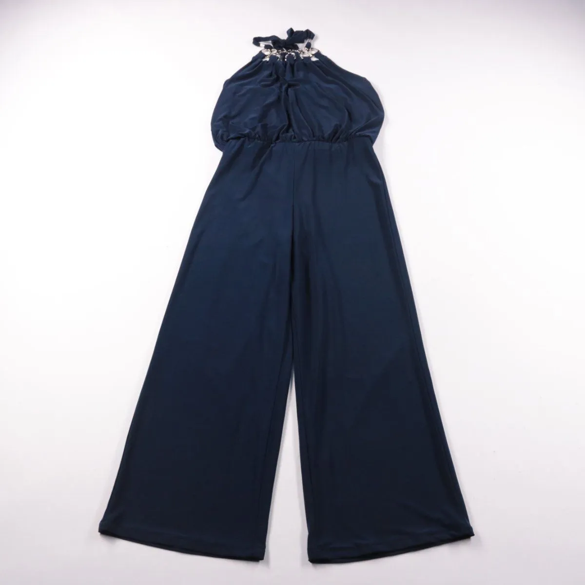 Женский комбинезон тёмно-синего цвета с верхом на бретелях и декоративной фурнитурой у горловины. Подойдёт для летних прогулок и неформальных выходов, свободный крой с широкими штанинами не сковывает движения. Практичен тем, что это готовый образ — достаточно добавить обувь и аксессуары.