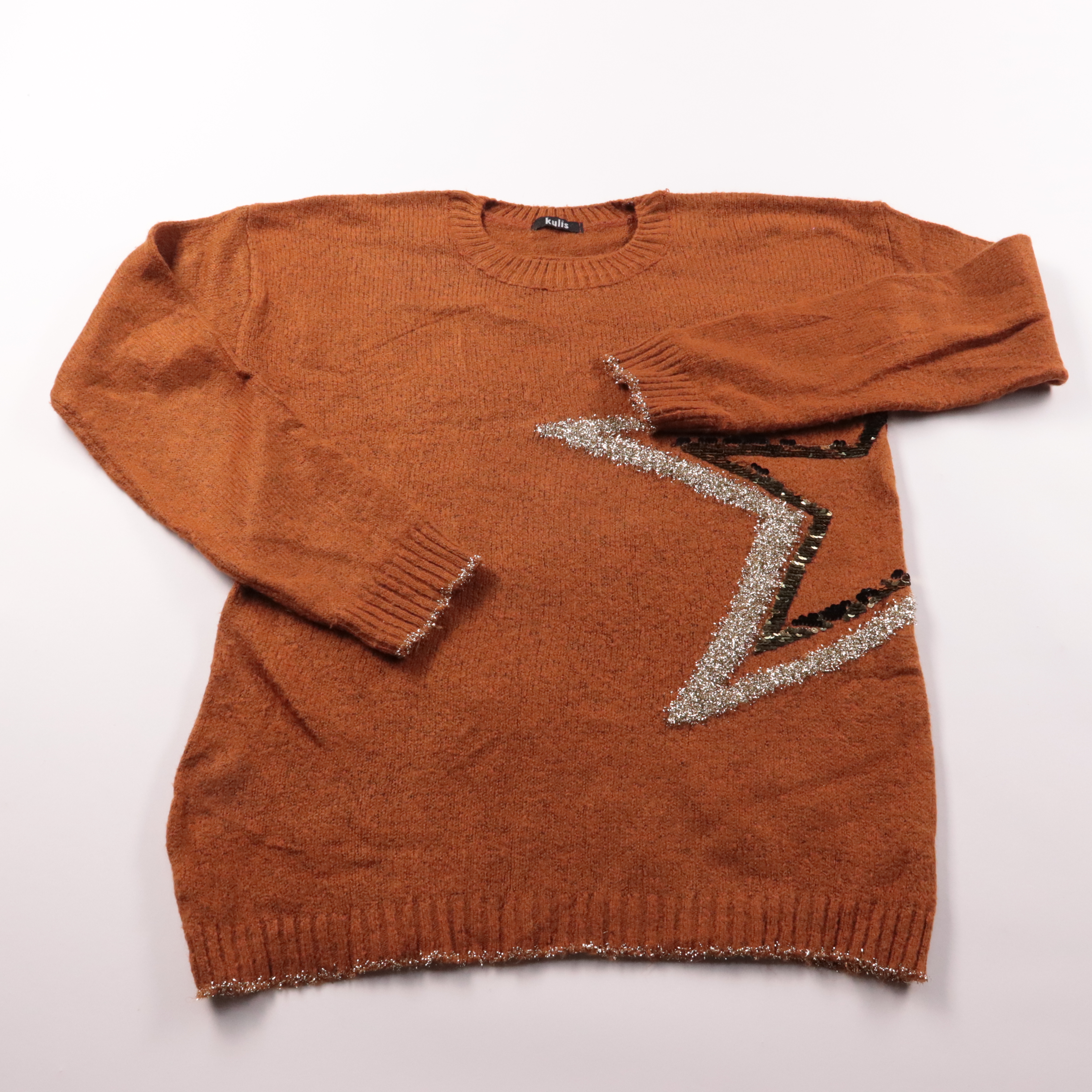 Свитер Kulis терракотового цвета с круглым вырезом и декоративной аппликацией-звездой из люрекса и пайеток. Подойдёт для повседневных образов в прохладную погоду, легко сочетается с джинсами и юбками. Мягкий микрофибровый акрил хорошо держит форму и не...