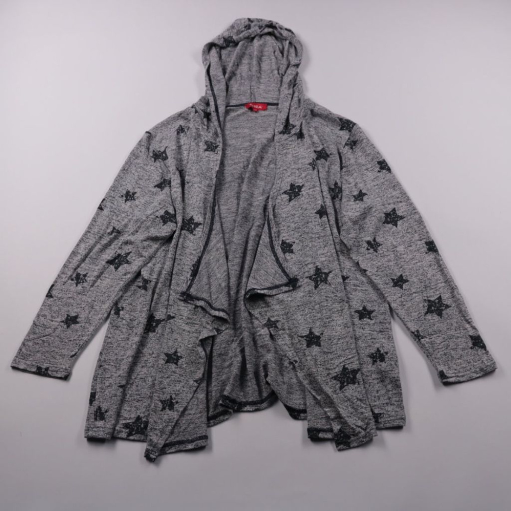 Кардиган Thea из мягкого трикотажа серого меланжа с принтом звёзды и капюшоном. Подойдёт для повседневных образов в прохладную погоду и как накидка поверх футболки или лонгслива. Практичен тем, что лёгкий и не стесняет движений.