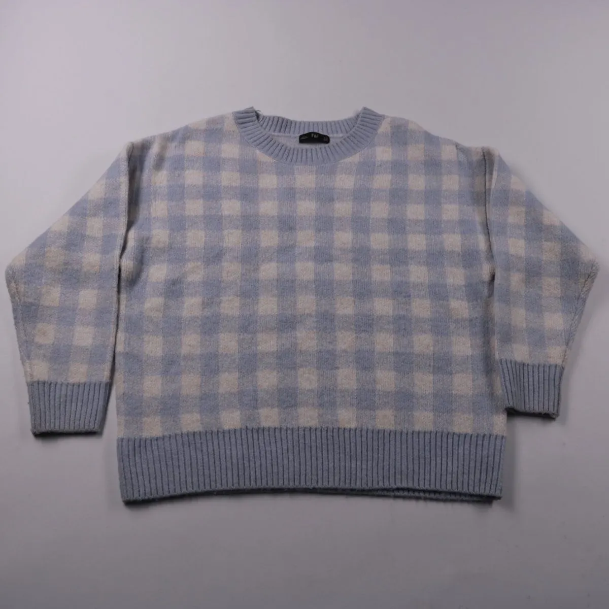 Женский джемпер F&F в голубо-белую клетку, с круглым вырезом и широкими манжетами/резинкой по низу. Подойдёт для повседневных образов в прохладную погоду, хорошо сочетается с джинсами и однотонными брюками. Мягкий трикотаж комфортно сидит и не сковывает движения.