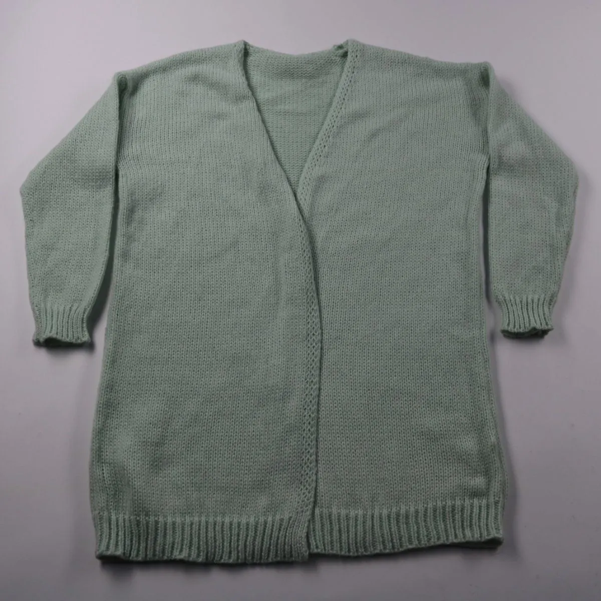 Вязаный кардиган без застёжки в нежном мятном оттенке, свободного прямого силуэта. Подойдёт для прохладных дней и многослойных образов с футболкой или водолазкой. Лёгкий полиэстер быстро сохнет и почти не мнётся в носке.