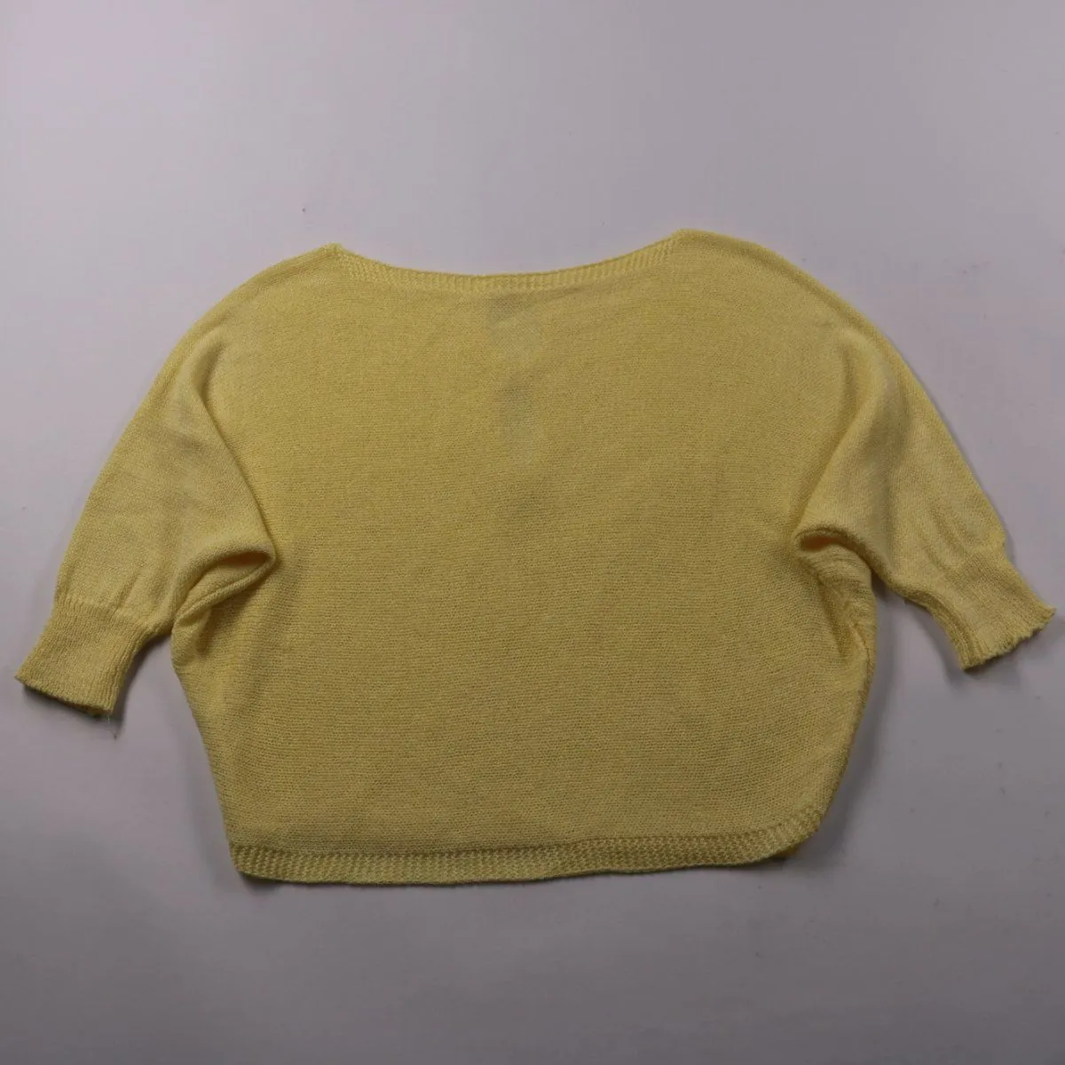 Вязаная женская кофта укороченного кроя светло-жёлтого цвета с коротким рукавом и застёжкой на пуговицы. Подойдёт для тёплой погоды и многослойных образов поверх топов и платьев. Лёгкий трикотаж хорошо проветривается и не занимает много места в сумке.