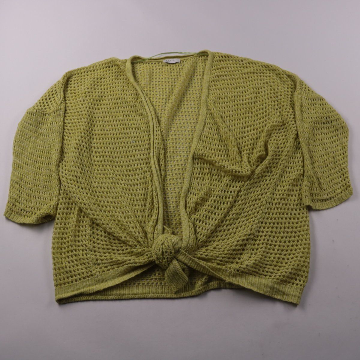 Женский ажурный кардиган Papaya свободного кроя с коротким рукавом и завязкой спереди. Подойдёт для летних образов и как лёгкая накидка на топ или платье. Пористая вязка хорошо пропускает воздух и почти не мнётся.