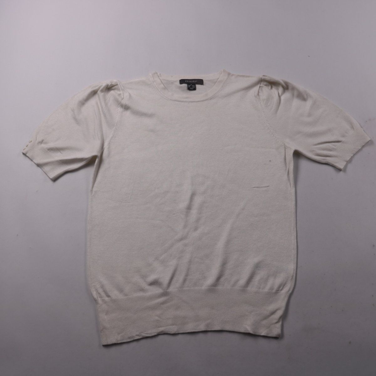 Женский трикотажный джемпер Primark молочного цвета с коротким рукавом и круглым вырезом. Подойдёт для повседневных образов и офиса в тёплое время или как слой под жакет. Мягкий материал и базовый цвет легко сочетаются с любыми брюками и юбками.