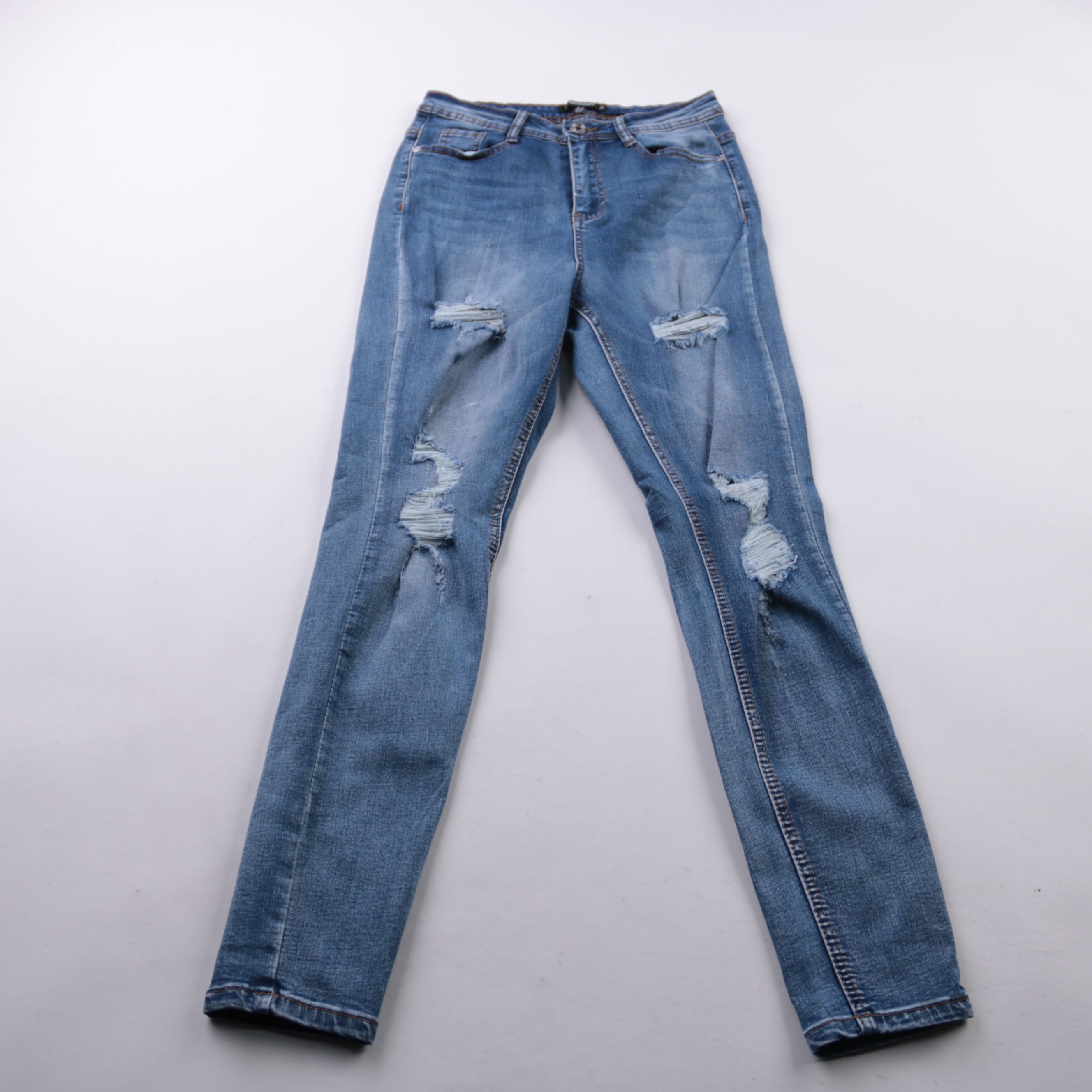 Женские джинсы Missguided из денима голубого цвета с декоративными потертостями и разрезами. Подойдут для повседневных образов с кедами или ботинками в любое время года. Плотный материал хорошо держит форму и удобен в носке.