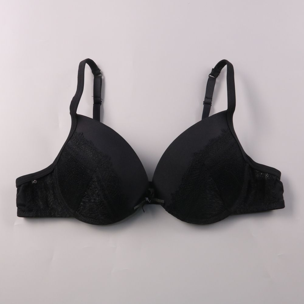 Чёрный бюстгальтер с формованными чашками и кружевными вставками по бокам. Подойдёт для повседневной носки под облегающую одежду благодаря гладкой чашке и регулируемым бретелям. Удобная посадка и поддержка за счёт плотной основы и застёжки сзади.