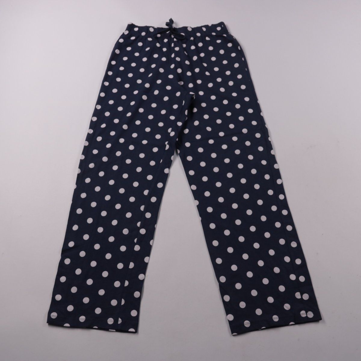 Пижамные брюки F&F в тёмно-синем цвете с белым горошком. Эластичный пояс с завязкой подойдёт для сна и домашнего отдыха. Лёгкая ткань удобно сидит и не стесняет движений.