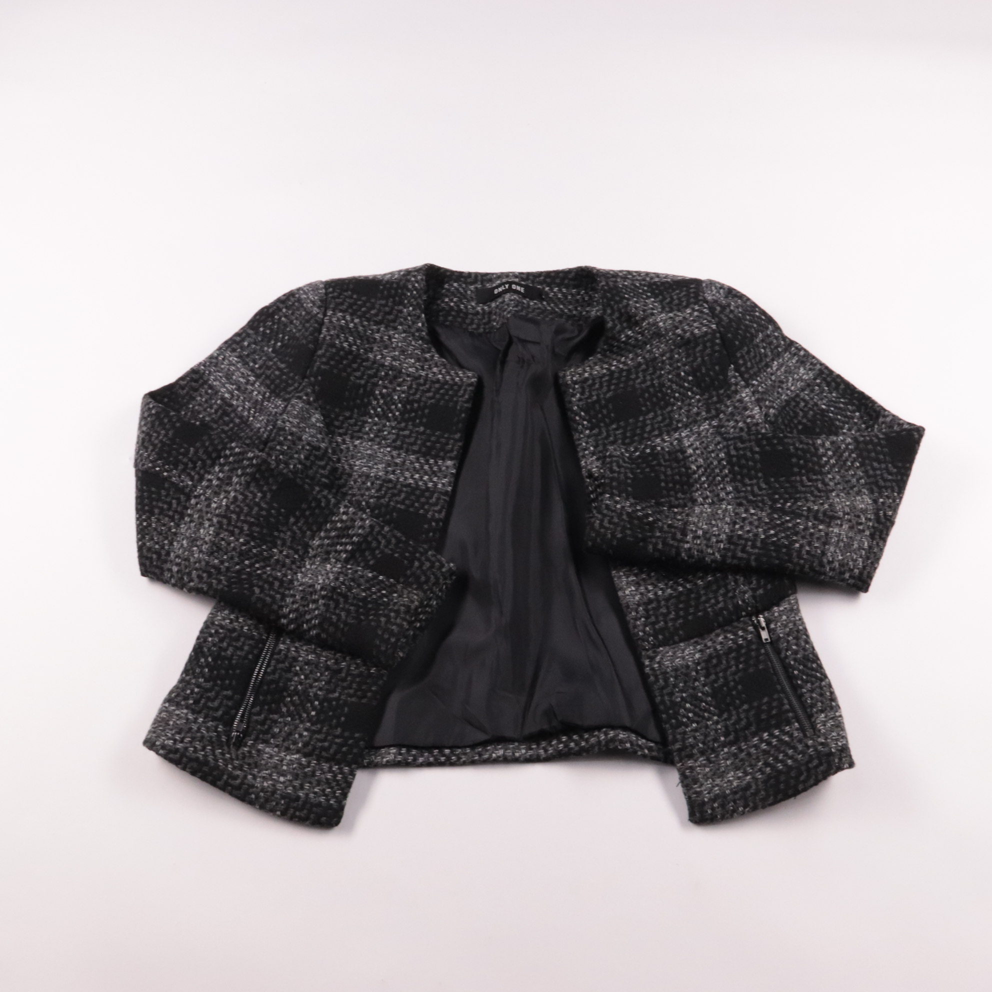 Женский укороченный пиджак Only One из фактурной твидовой ткани в серо‑чёрную клетку, без лацканов, с карманами на молниях. Подойдёт для офиса и повседневных образов в прохладную погоду, хорошо смотрится с джинсами и платьями. Практичный плюс — плотный...