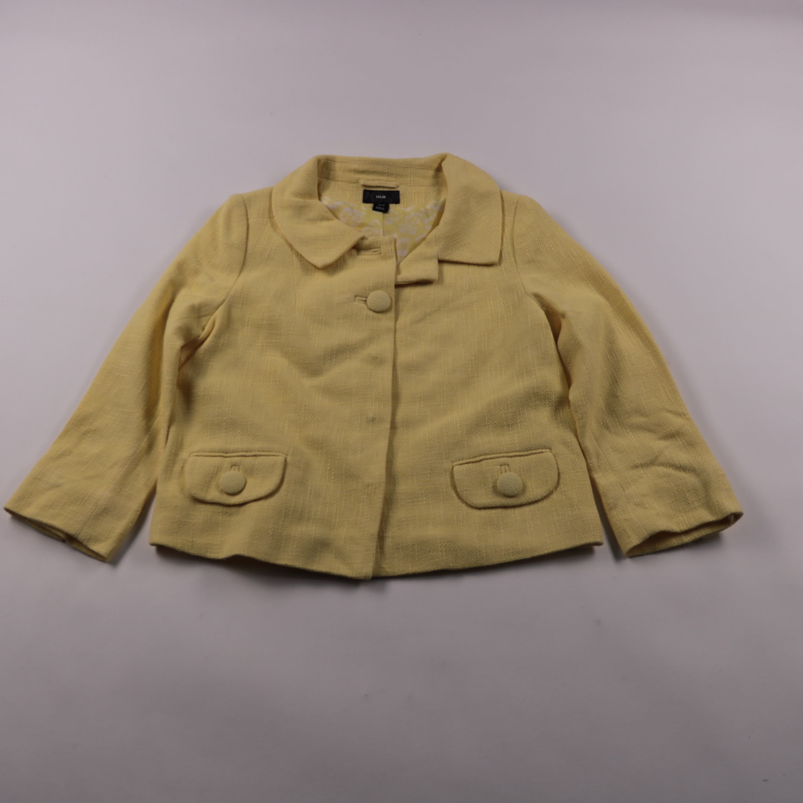 Женский укороченный пиджак H&M из фактурной ткани твидового типа в нежно‑жёлтом цвете, с отложным воротником и накладными карманами на пуговицах. Подойдёт для офиса и повседневных образов в весенне-осенний сезон, легко сочетается с джинсами и юбками. П...