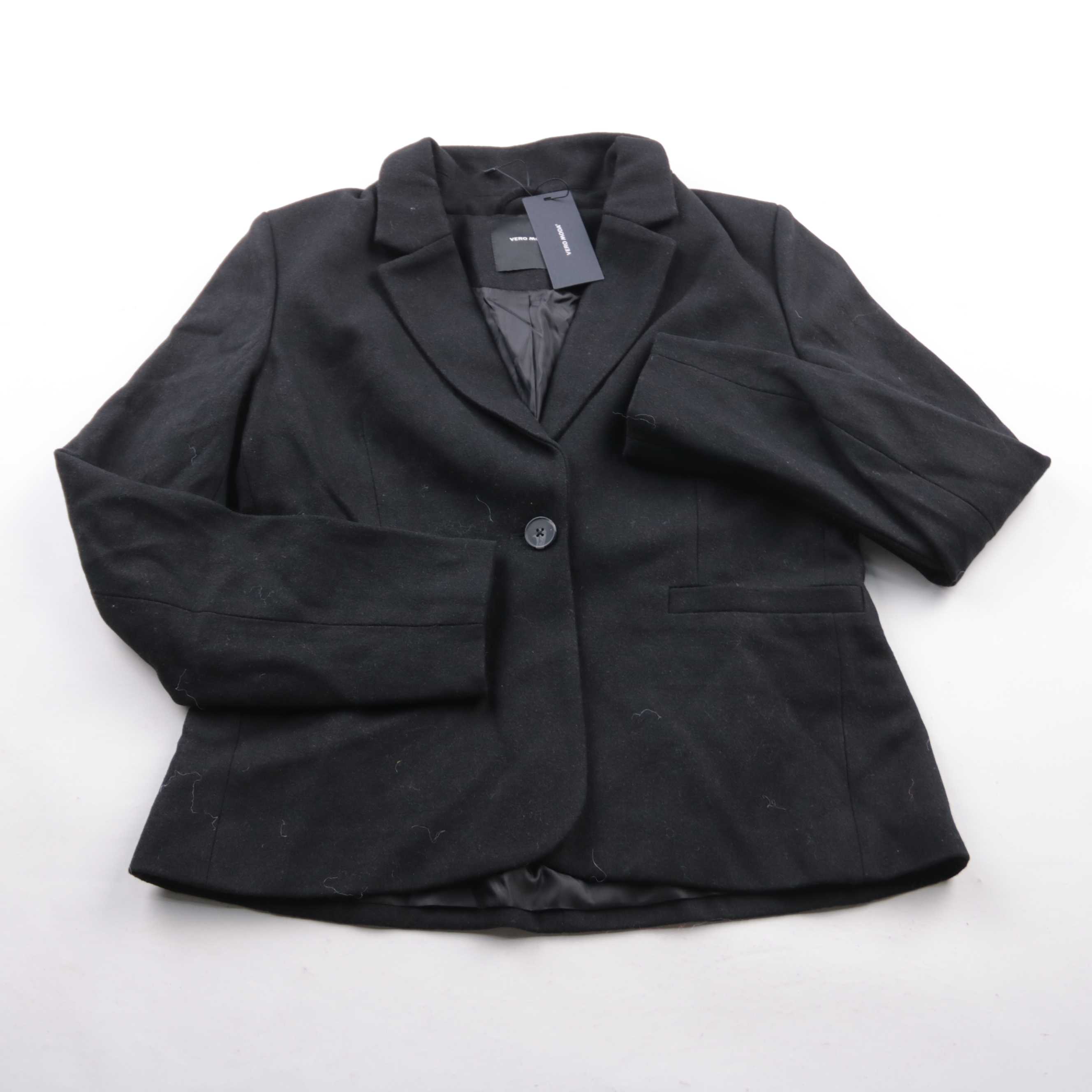 Чёрный пиджак Vero Moda приталенного кроя на одной пуговице, с лацканами и карманами. Подойдёт для офиса, собеседований и повседневных образов с джинсами или платьем. Смесь шерсти в составе делает ткань более тёплой и держит форму.