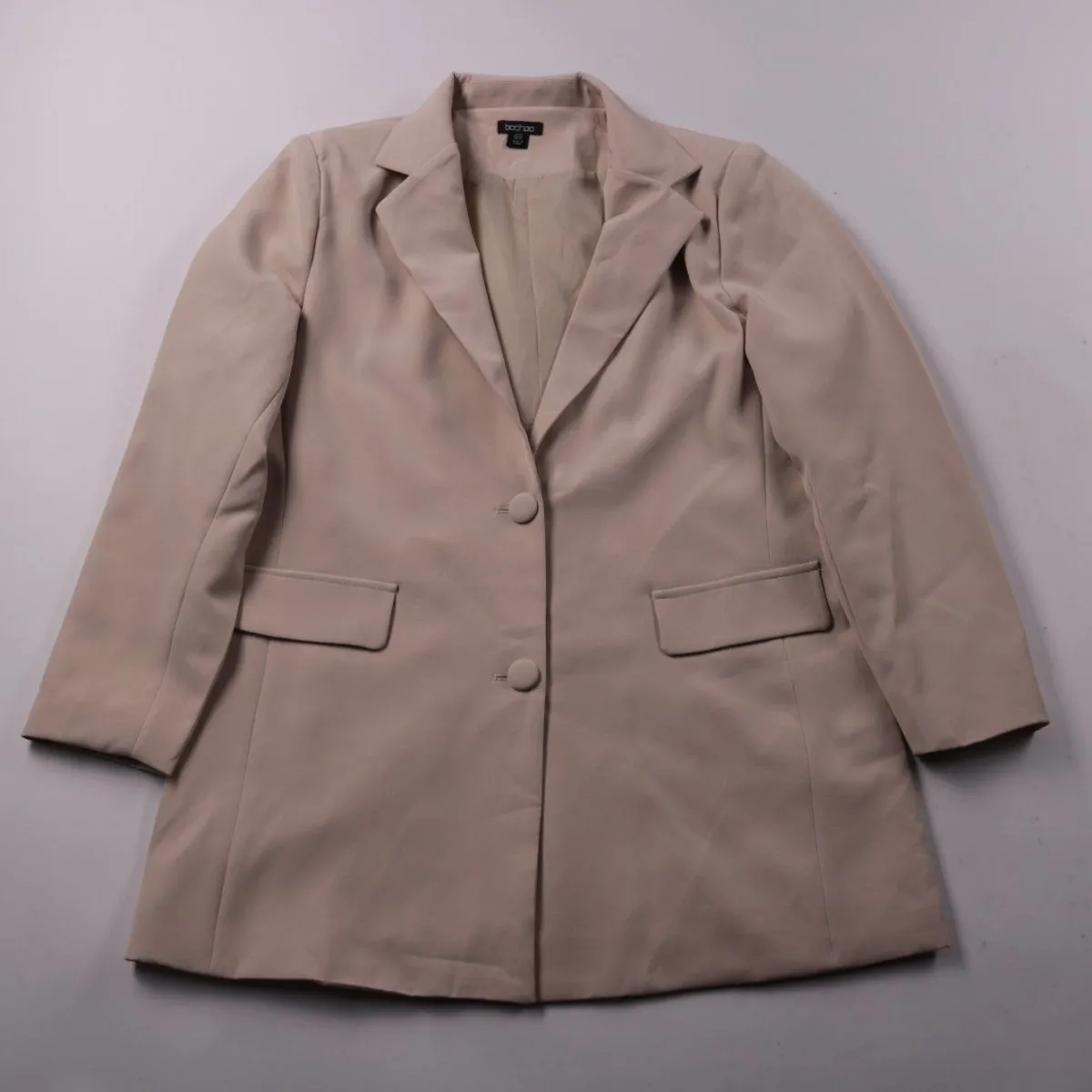 Женский удлинённый пиджак Boohoo бежевого цвета, с лацканами и застёжкой на пуговицы. Подойдёт для офиса и повседневных образов в прохладную погоду. Практичен тем, что легко сочетается с брюками, джинсами и платьями.