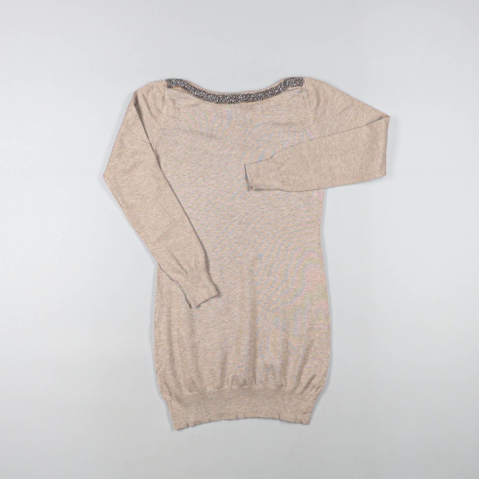 Трикотажное платье-джемпер в бежевом цвете с длинным рукавом и лодочкой, по краю горловины есть отделка с пайетками. Сзади декоративные бантики, модель подойдёт для повседневных образов в прохладную погоду. Мягкий трикотаж тянется и комфортно сидит, уд...