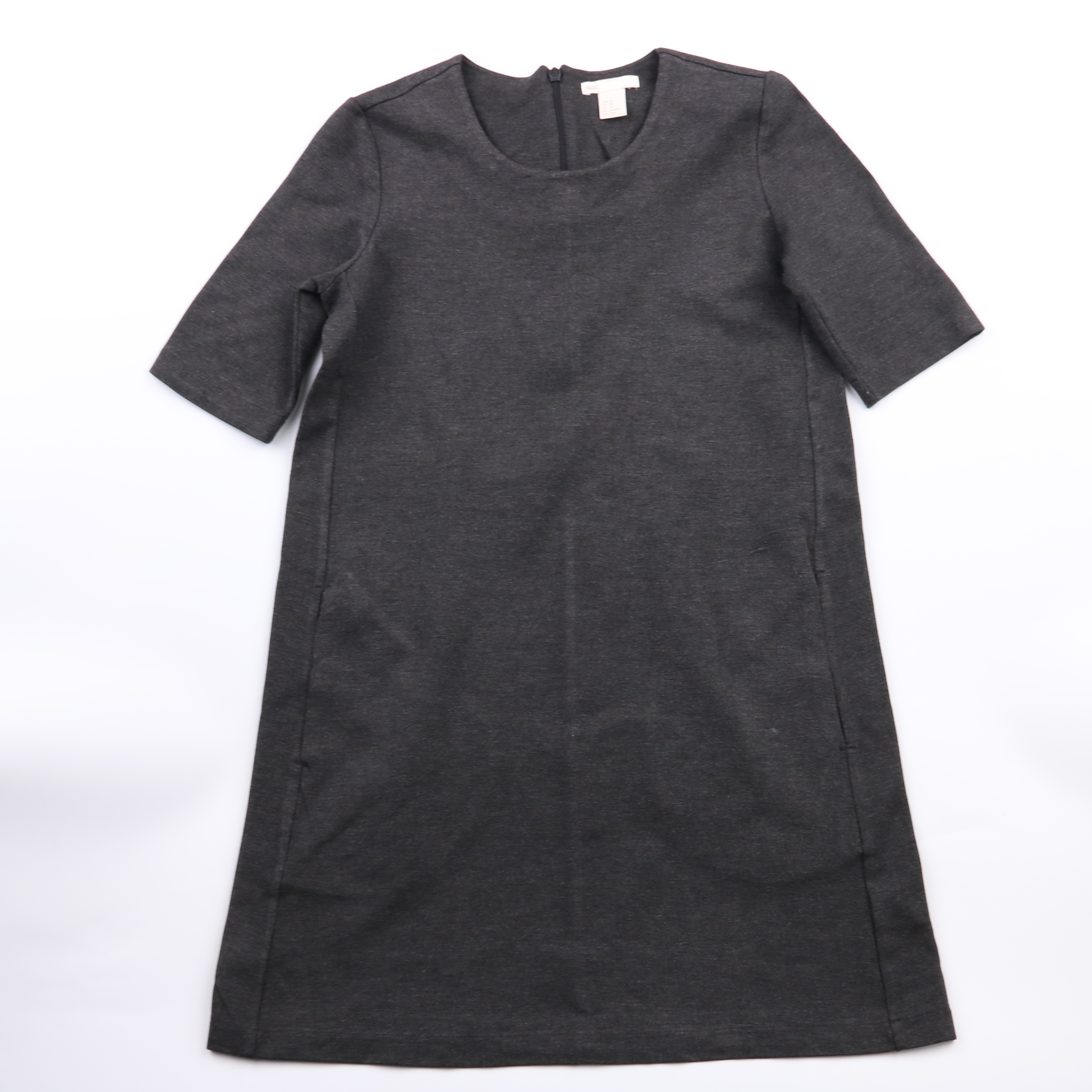 Повседневное платье H&M Basic тёмно-серого цвета, прямого кроя с коротким рукавом и застёжкой-молнией сзади. Подойдёт для офиса и на каждый день, легко сочетается с жакетом или кардиганом. Ткань с эластаном чуть тянется и комфортно садится по фигуре.