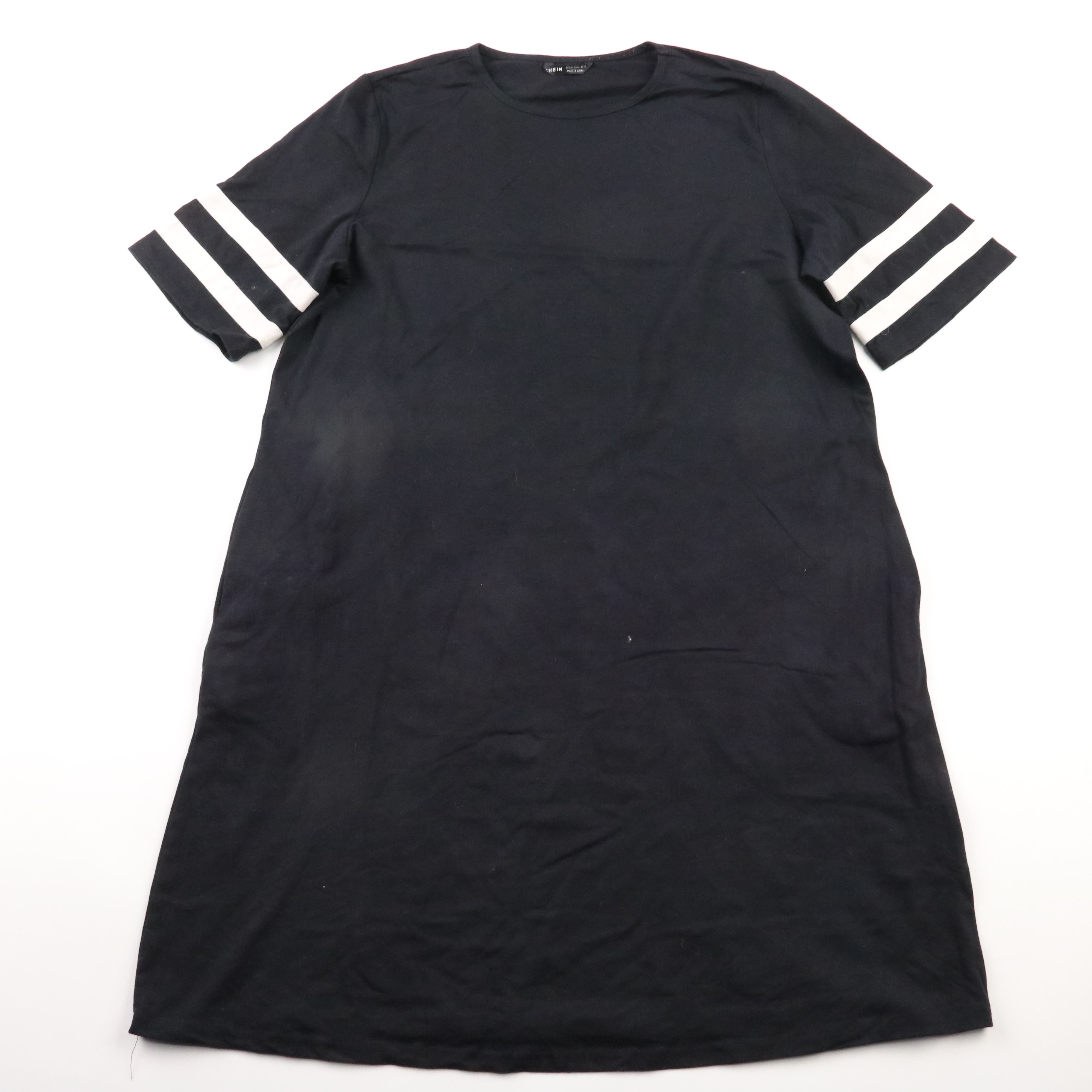Повседневное платье Shein прямого кроя из эластичного трикотажа, чёрного цвета с белыми полосками на рукавах. Подойдёт для прогулок и повседневных образов с кедами или кроссовками. Материал тянется и комфортно садится по фигуре.