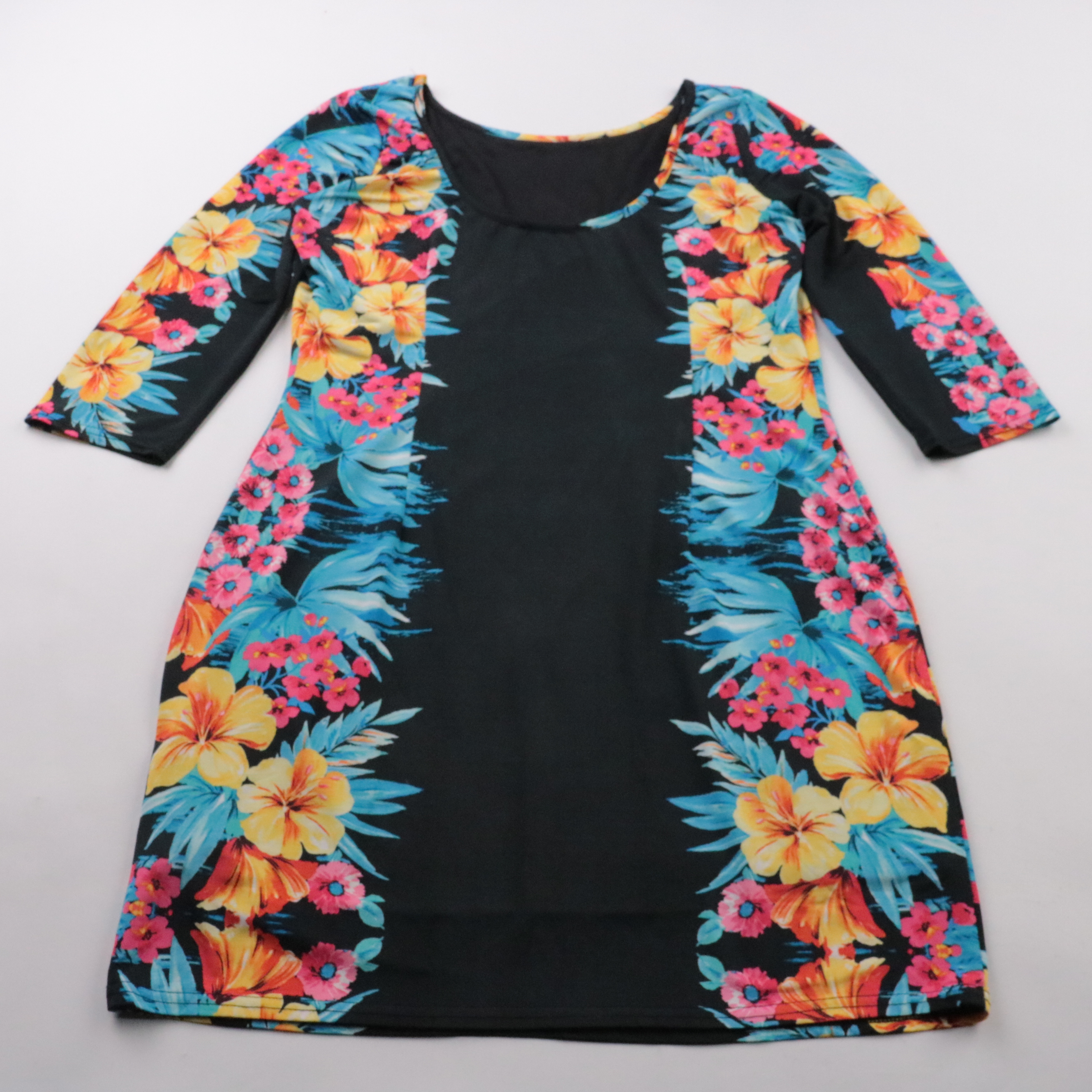 Повседневное платье Atmosphere с рукавом 3/4 и ярким цветочным принтом по бокам. Подойдёт для офиса и прогулок, хорошо сочетается с однотонной обувью и жакетом. Эластичная ткань комфортно садится по фигуре и почти не мнётся.