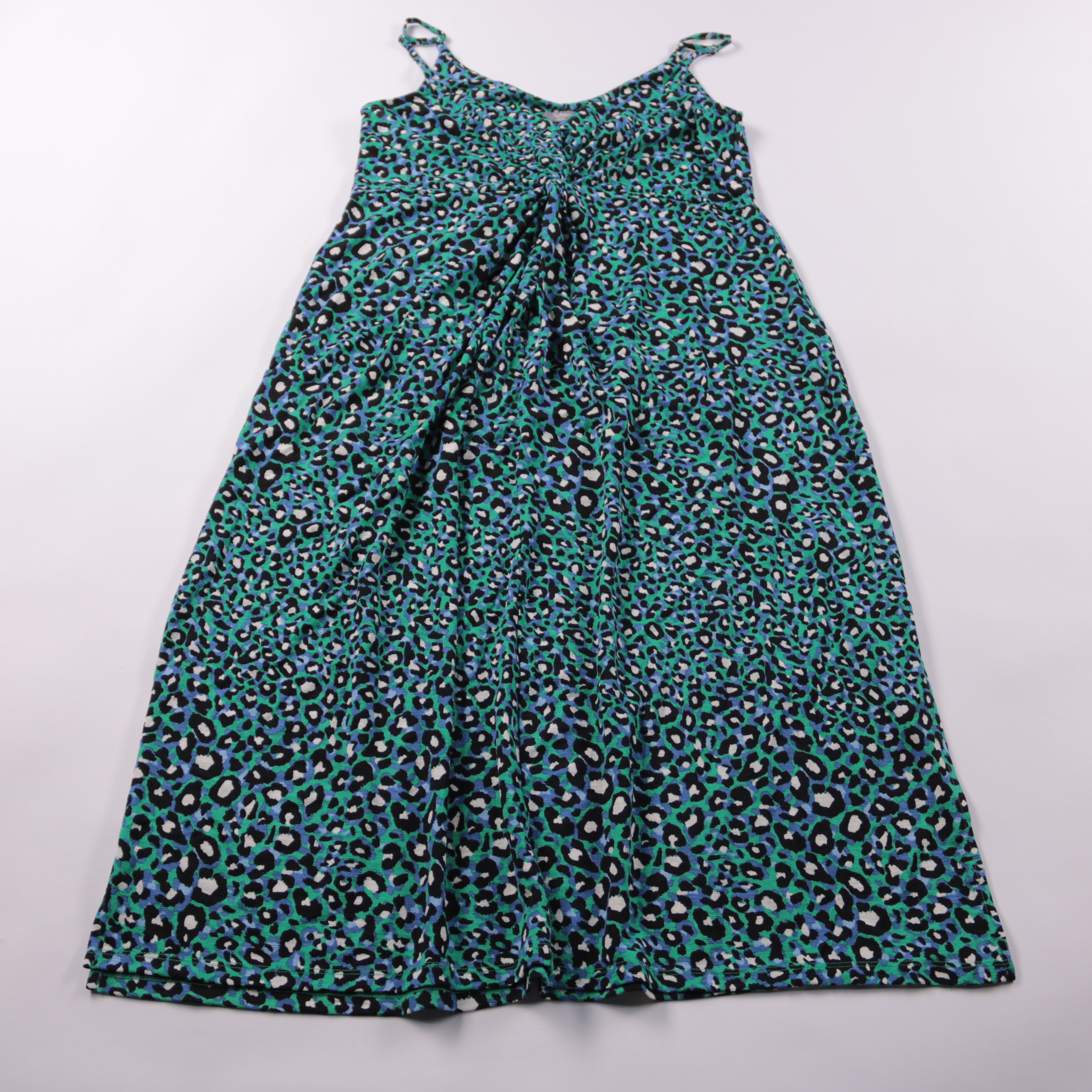 Летнее платье Nutmeg на тонких бретелях с леопардовым принтом и мягкой драпировкой на груди. Подойдёт для повседневных прогулок и отпуска, легко сочетается с сандалиями или кедами. Ткань эластичная и почти не мнётся, удобно брать в дорогу.