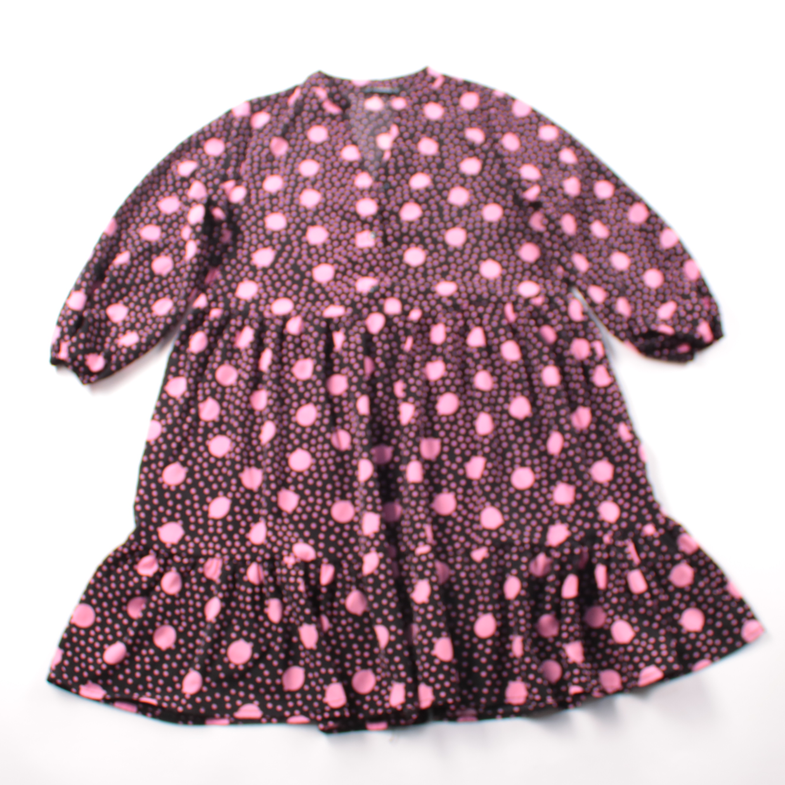 Повседневное платье Dunnes с ярусной юбкой и рукавами 3/4, чёрное с розовым принтом. Подойдёт для прогулок и на каждый день, хорошо сочетается с кедами или ботинками. Лёгкий полиэстер почти не мнётся и быстро сохнет.
