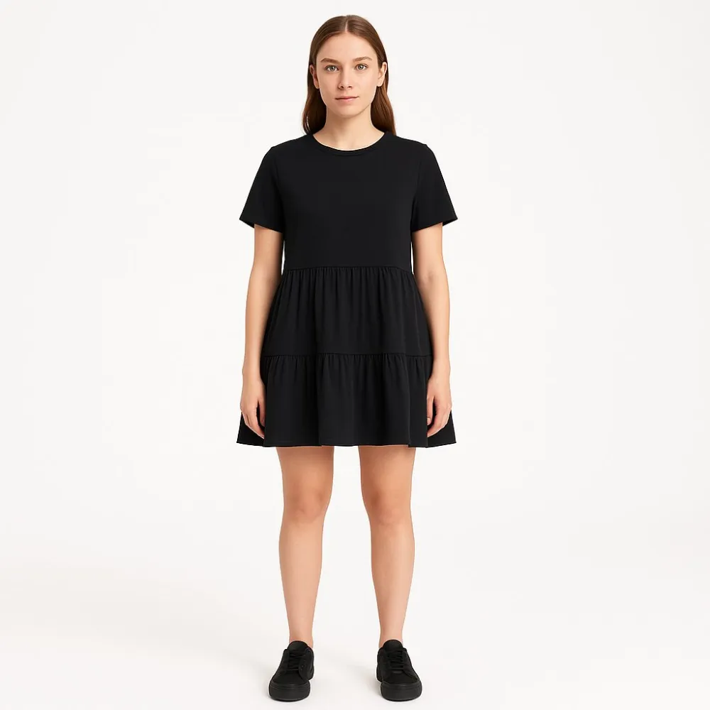 Повседневное платье New Look чёрного цвета, свободного кроя с ярусной юбкой и коротким рукавом. Подойдёт на каждый день и для прогулок в тёплую погоду, легко сочетается с кедами или сандалиями. Натуральный хлопок приятен к телу и хорошо пропускает воздух.
