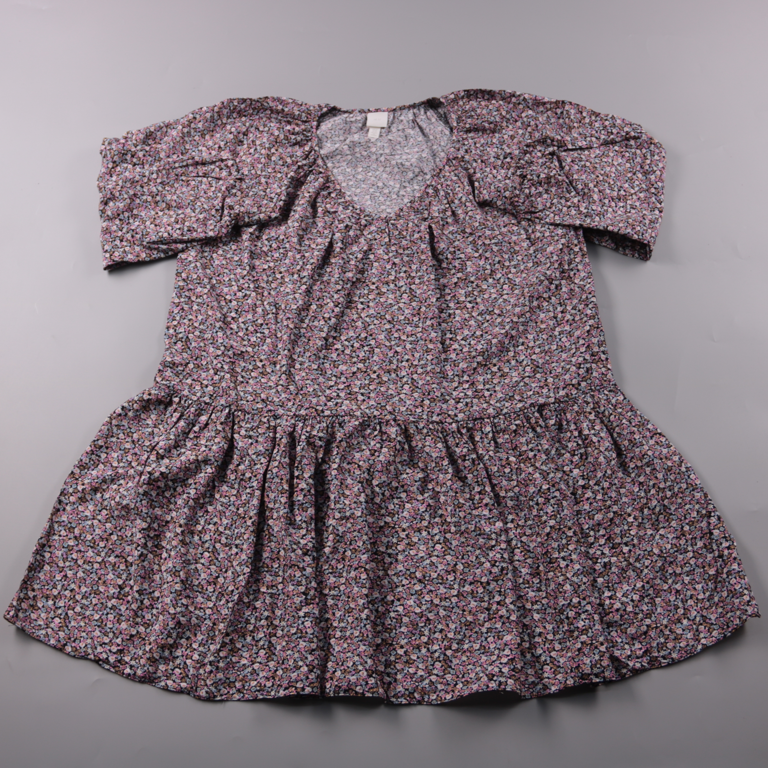 Повседневное платье H&M с мелким цветочным принтом и объёмными рукавами. Подойдёт для летних прогулок и повседневных образов, хорошо смотрится с кедами или сандалиями. Лёгкая вискозная ткань приятна к телу и удобно носится в жару.
