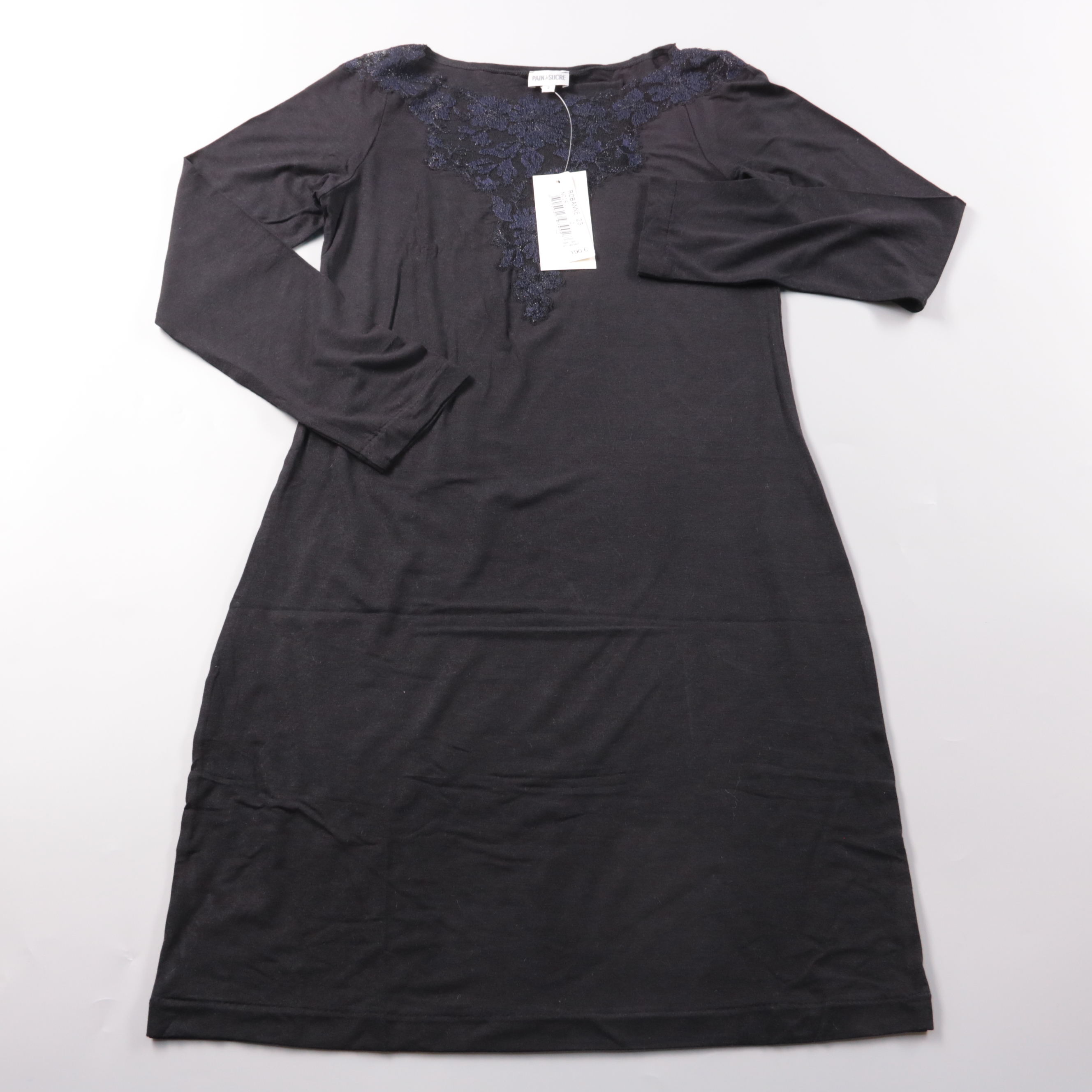 Повседневное платье Pain de Sucre чёрного цвета с кружевной вставкой по линии декольте и рукавом 3/4. Подойдёт для офиса и на каждый день, легко сочетается с жакетом и лодочками. Эластичная ткань хорошо садится по фигуре и комфортна в носке.