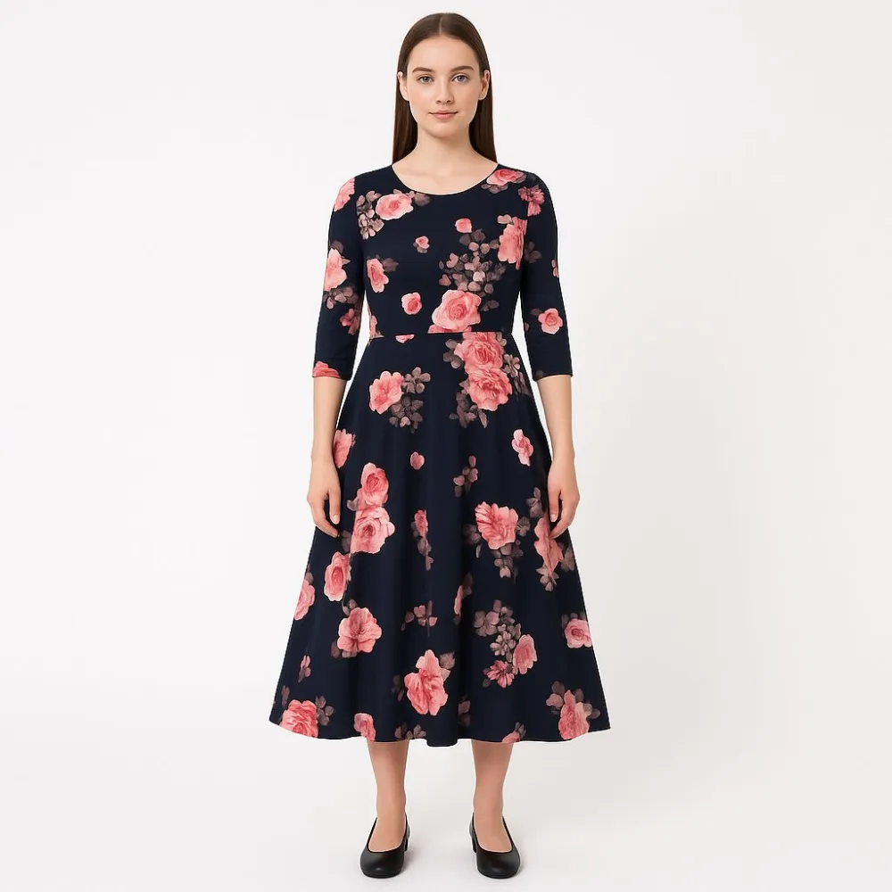 Повседневное платье Chicoree тёмно-синего цвета с розовым цветочным принтом, рукав 3/4 и расклёшенная юбка миди. Подойдёт для офиса, прогулок и встреч, легко сочетается с лодочками или балетками. Трикотаж с эластаном хорошо тянется и комфортно садится ...