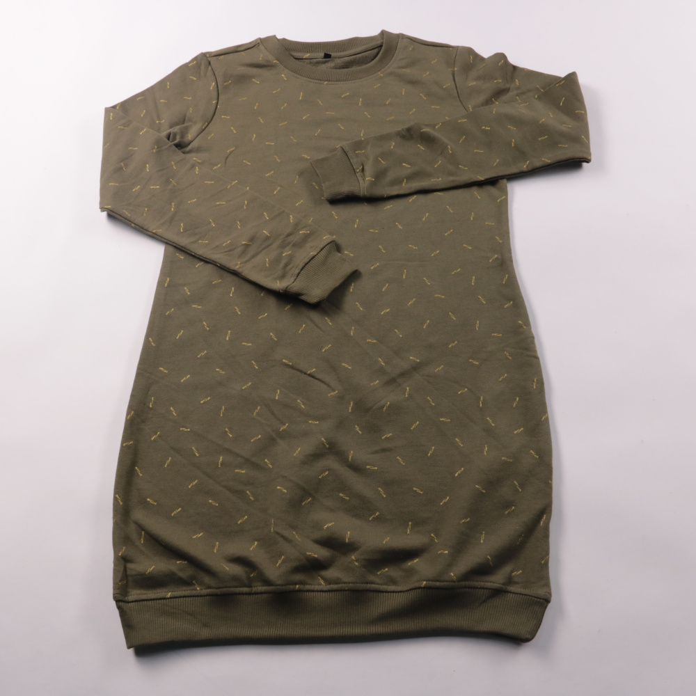 Повседневное платье-свитшот прямого кроя из мягкого трикотажа цвета хаки с мелким принтом. Подойдёт для прогулок и на каждый день, удобно сочетать с кедами или ботинками. Плотная ткань и манжеты по низу и рукавам помогают сохранять тепло и форму.