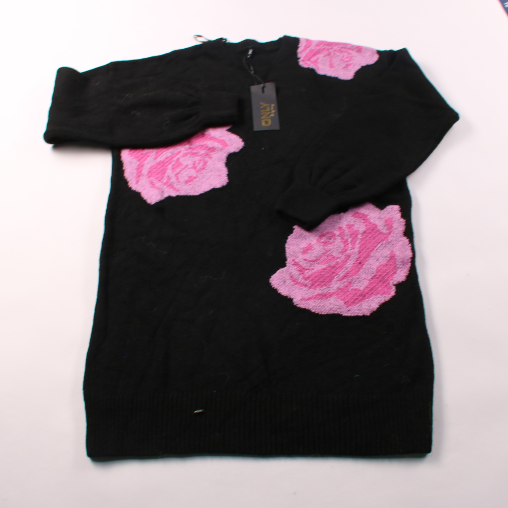 Трикотажное платье Only чёрного цвета с контрастным жаккардовым рисунком роз в розовых оттенках и длинным рукавом. Подойдёт для повседневных образов в прохладную погоду, хорошо сочетается с ботинками или кроссовками. Плотная вязка держит форму и не тре...