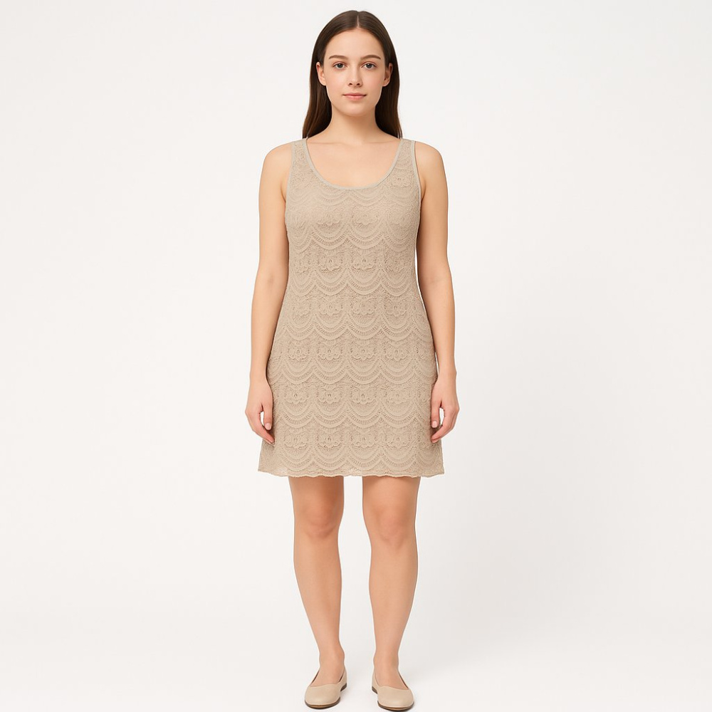 Короткое повседневное платье Pimkie из вискозы, бежевого цвета, с ажурной фактурой и округлым вырезом. Подойдёт для прогулок и летних встреч, легко сочетается с балетками или кедами. Материал мягкий и хорошо дышит в жару.