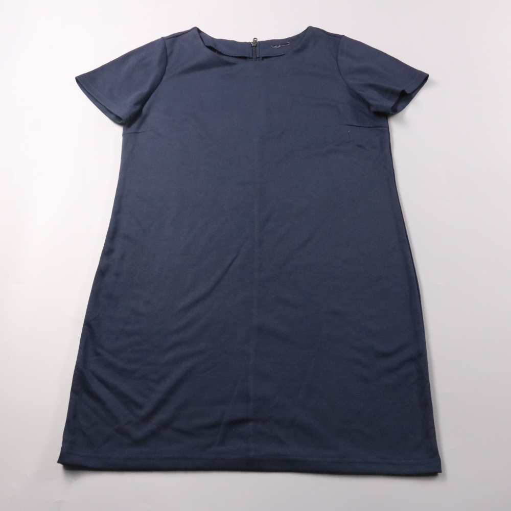 Женское тёмно-синее повседневное платье прямого кроя с коротким рукавом и круглым вырезом, застёжка-молния сзади. Подойдёт для офиса и на каждый день, легко сочетается с жакетом или кардиганом. Практичный плюс — лаконичный фасон и немаркий цвет.
