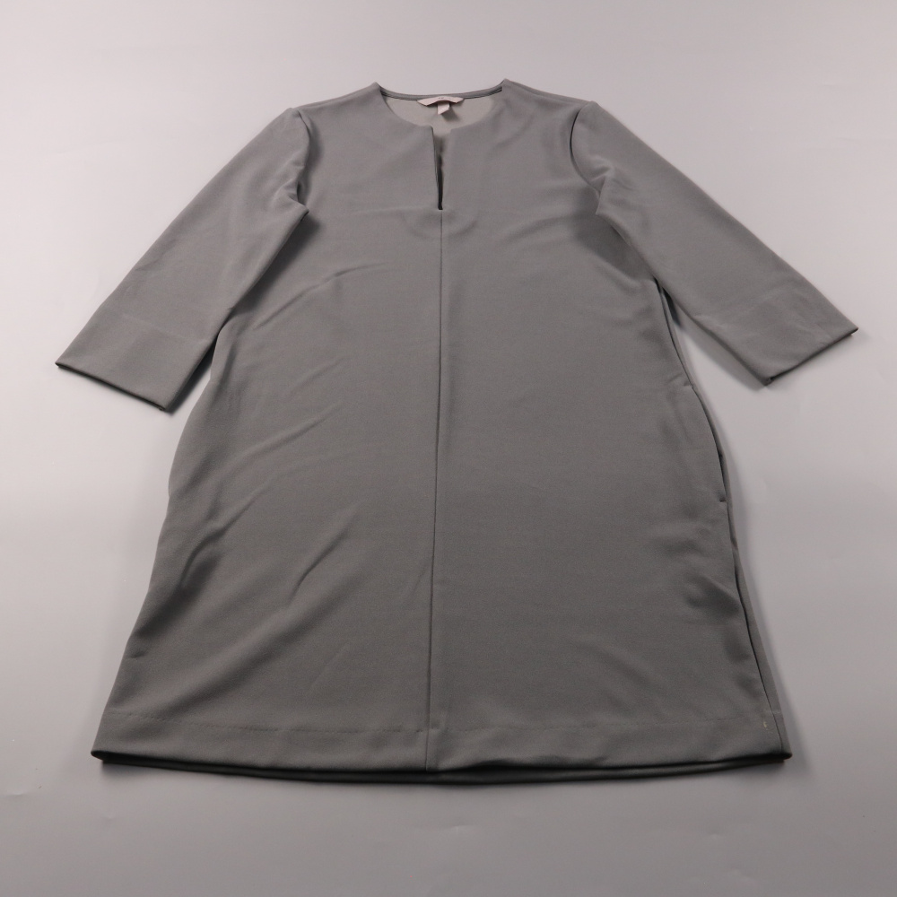 Серое платье H&M прямого кроя с рукавом 3/4 и аккуратным разрезом у горловины. Подойдёт для офиса и повседневных выходов, легко сочетается с жакетом и обувью на низком ходу. Практичное: немаркий цвет и простая форма, удобно носить каждый день.