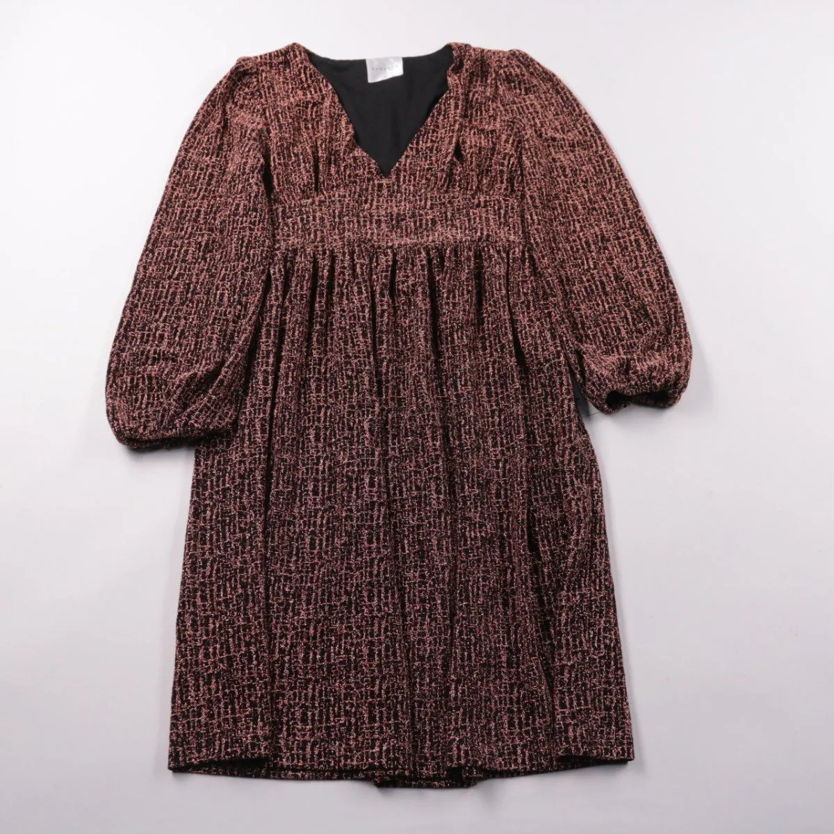 Повседневное платье Anonyme из фактурной ткани в бордово-чёрной гамме, с V-образным вырезом и объёмными рукавами. Подойдёт для офиса, прогулок и встреч в прохладную погоду, хорошо сочетается с ботинками и лоферами. Материал плотный и держит форму, а подкладка делает посадку комфортнее.