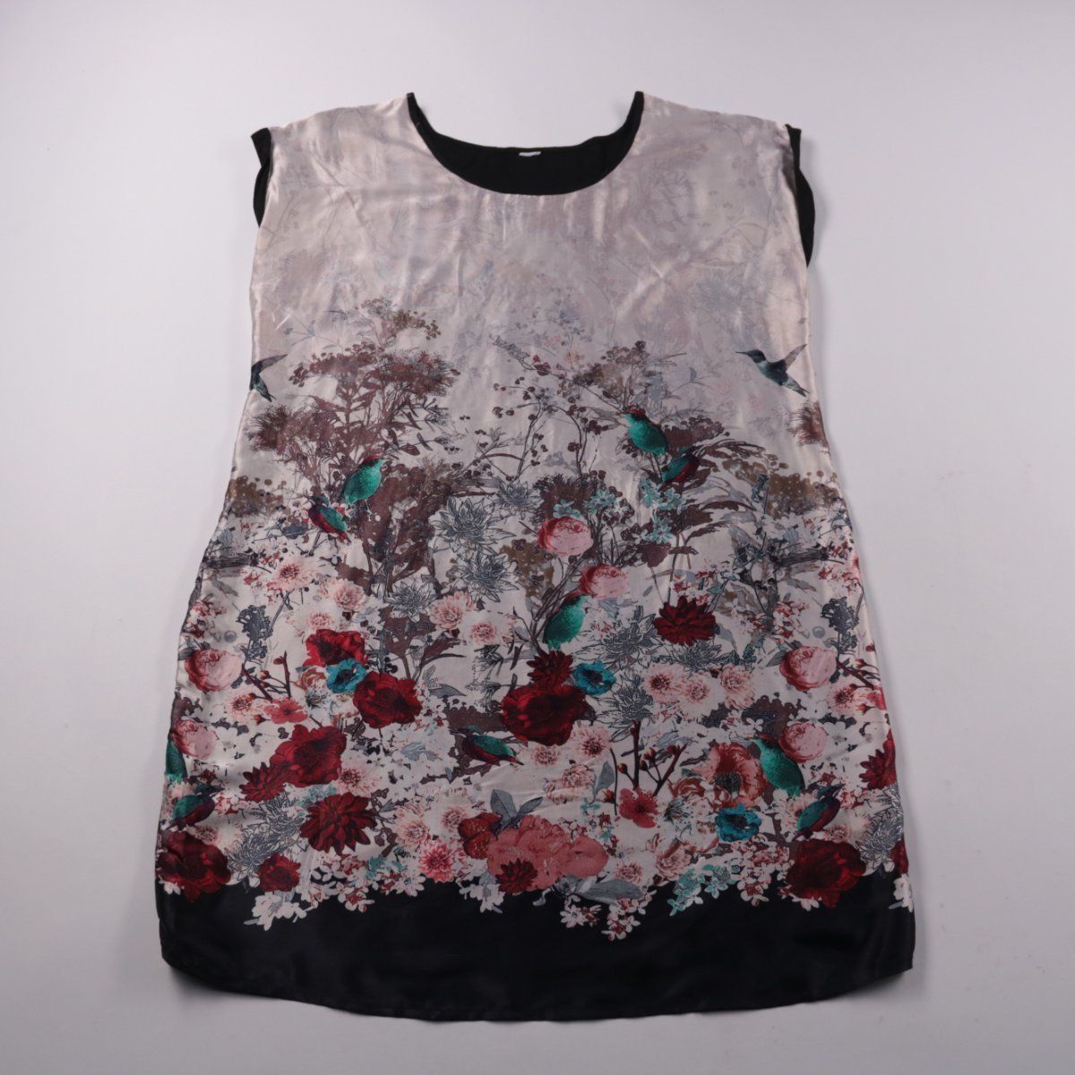 Женское платье без рукавов с цветочным принтом и контрастной чёрной отделкой по горловине и низу. Подойдёт для летних прогулок и повседневных выходов, хорошо сочетается с балетками или кедами. Лёгкая ткань комфортна в носке и проста в уходе.