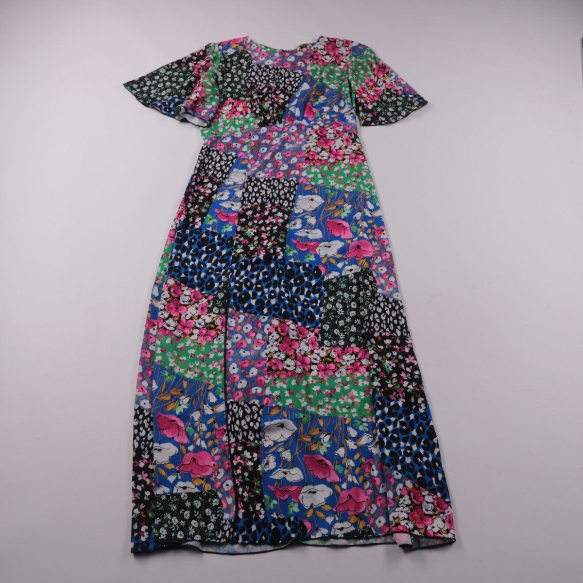 Женское повседневное платье-макси с короткими рукавами и ярким принтом в стиле пэчворк (цветочные и анималистичные элементы). Подойдёт для летних прогулок и повседневных образов благодаря свободному крою. Практичное преимущество — ткань выглядит немнущейся и не требует сложного ухода.