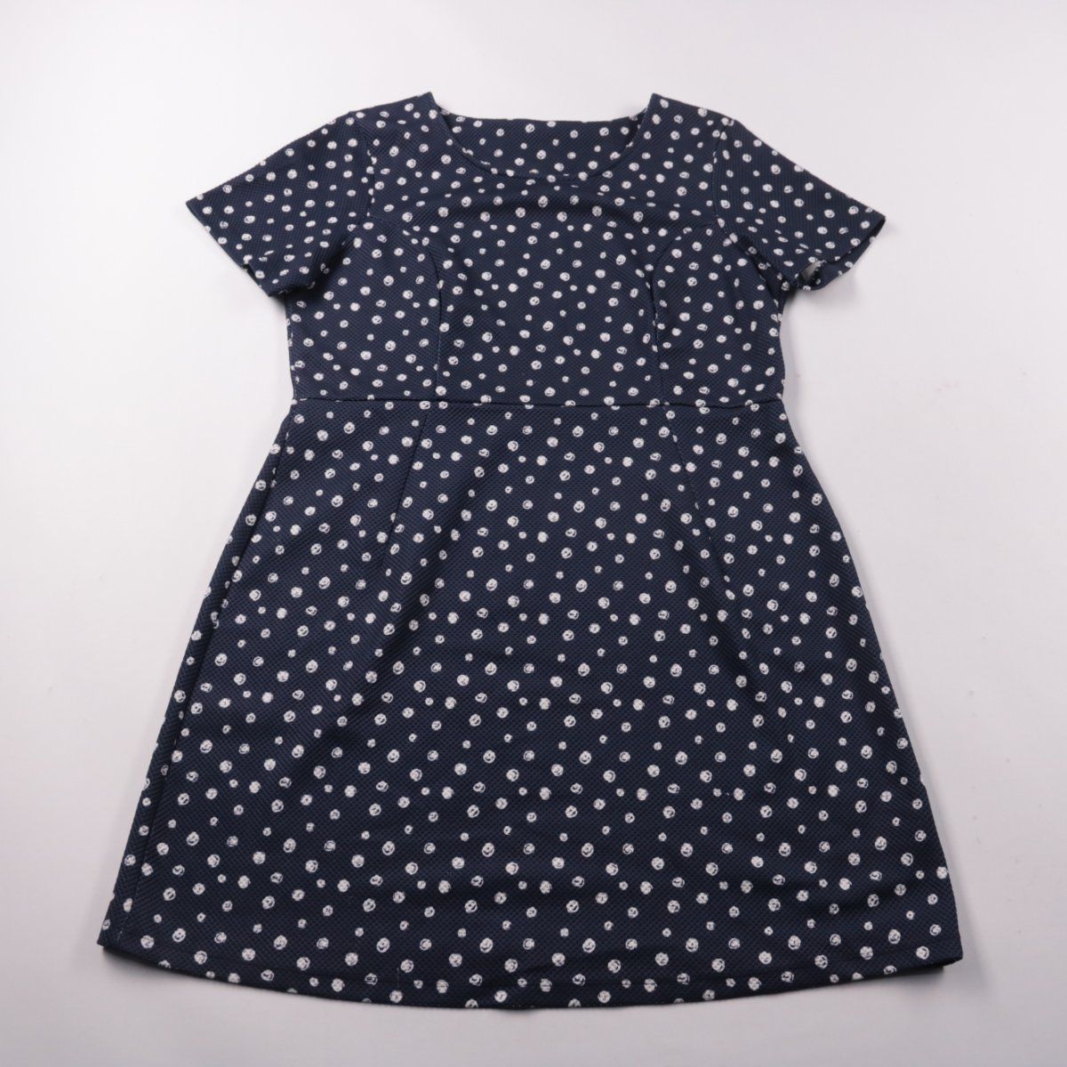 Повседневное платье TU тёмно-синего цвета в белый горох, с коротким рукавом и приталенным кроем с расклёшенной юбкой. Подойдёт для прогулок, работы или учёбы в тёплый сезон. Ткань со стрейчем хорошо садится по фигуре и проста в уходе.