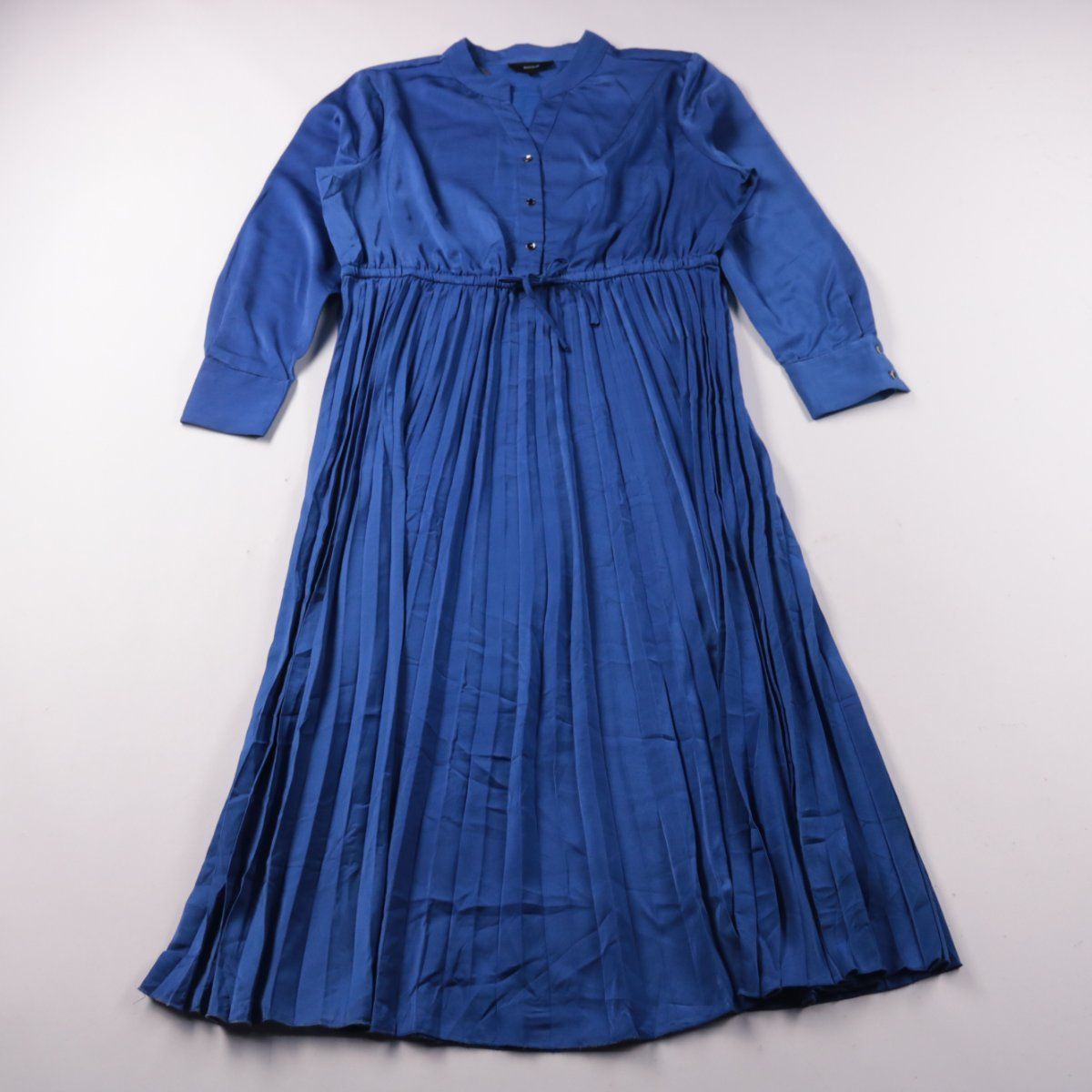 Повседневное платье Basque насыщенного синего цвета с длинным рукавом, планкой на пуговицах и поясом на кулиске. Подойдёт для офиса и прогулок в прохладную погоду, плиссированная юбка красиво держит форму. Практичный плюс — ткань из полиэстера почти не мнётся и проста в уходе.