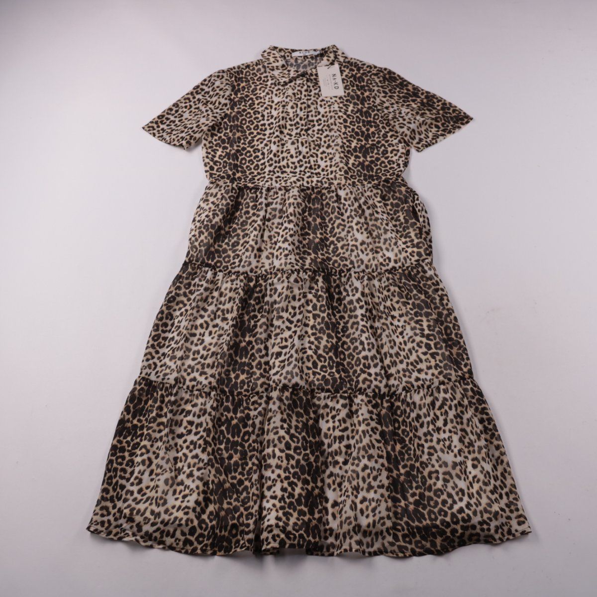 Повседневное платье NA-KD с леопардовым принтом, отложным воротником и короткими рукавами. Модель с ярусной юбкой подойдёт для прогулок и летних повседневных образов. Лёгкий полиэстер практичен в уходе и быстро сохнет.