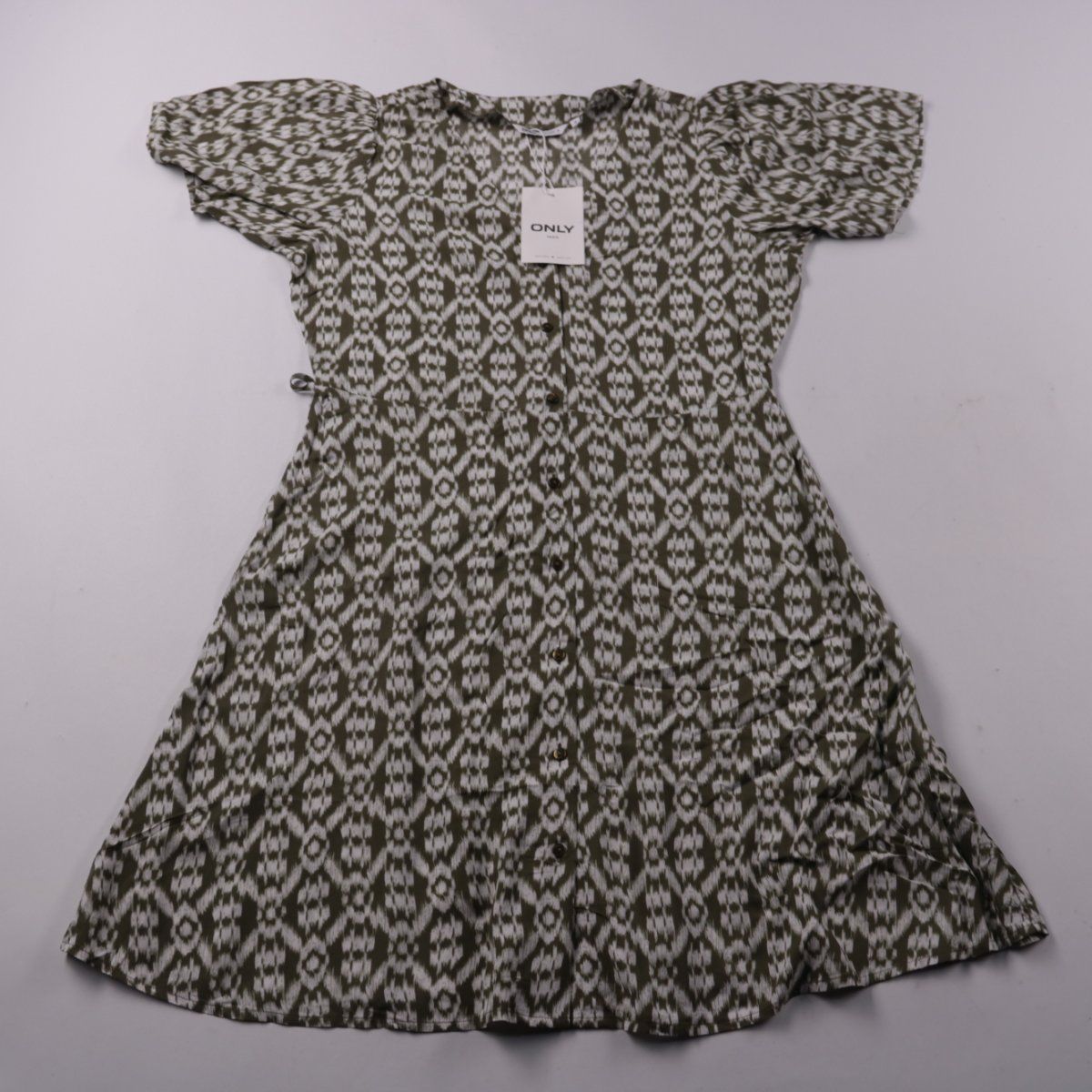Повседневное платье Only из 100% вискозы с геометрическим принтом в зелёно-белых тонах, с коротким рукавом и застёжкой на пуговицы спереди. Подойдёт для лета и тёплой весны, удобно комбинируется с кедами или сандалиями. Лёгкая ткань хорошо дышит и комфортна в жару.